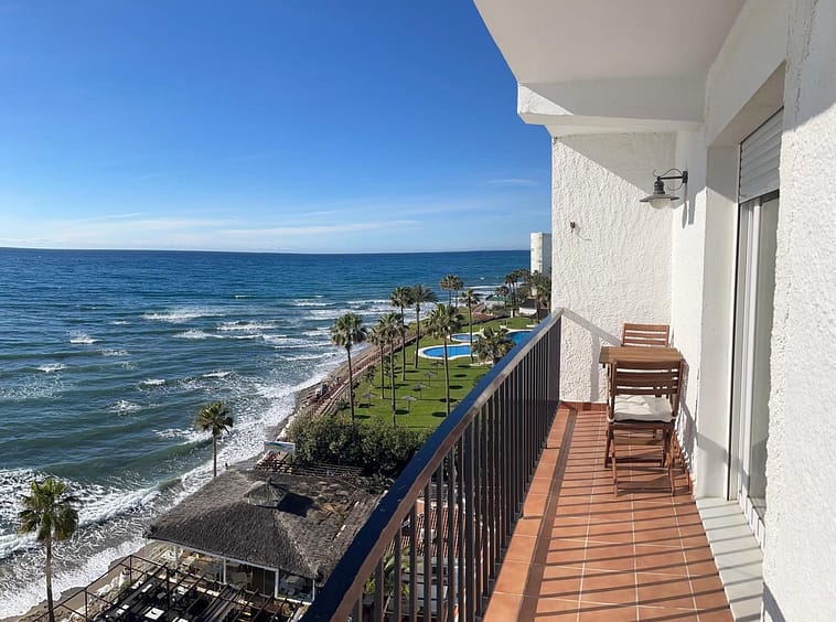 Discover a true beachfront gem in Calahonda. This fully renovated corner apartment, located on the front line of the beach, stands out for an exceptional and rarely found feature: a large wraparound terrace that surrounds almost the entire property, creating a unique sense of space, light, and outdoor living with the Mediterranean as its constant backdrop.