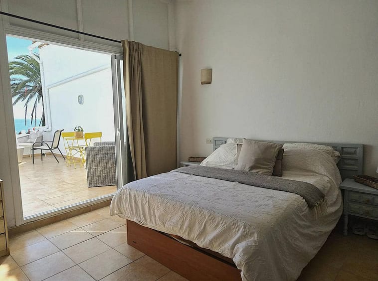 Upstairs, the generous bedroom offers built-in wardrobes and an adjoining bathroom. Elegant glass French doors open to stunning sea views, allowing you to wake up and enjoy the Mediterranean from the comfort of your bed.