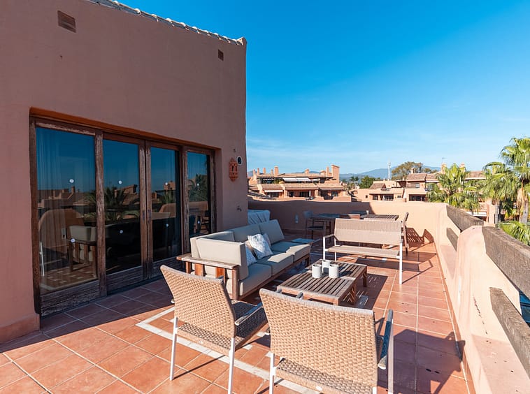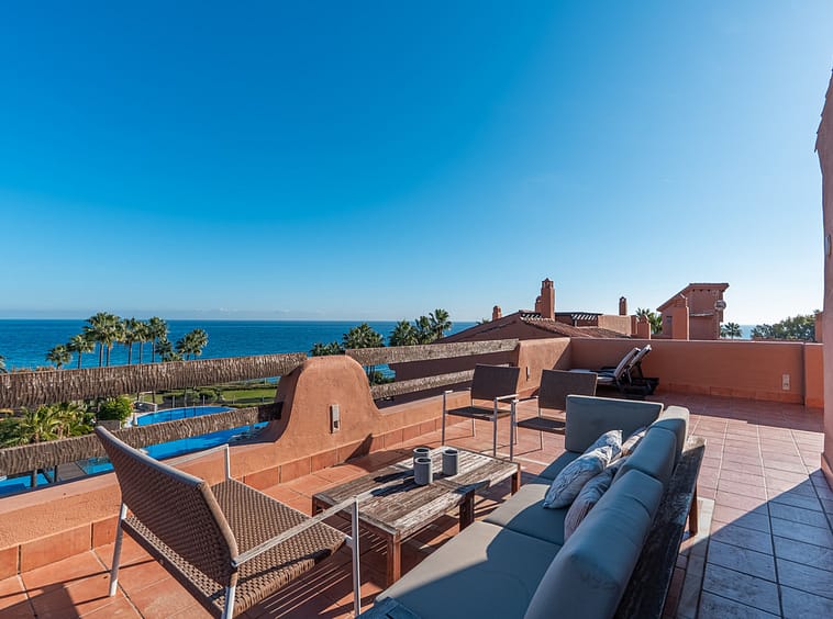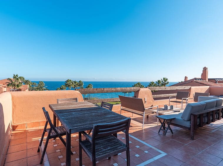 Discover an exquisite beachfront penthouse in Estepona East, offering panoramic sea views and an exceptional Costa del Sol lifestyle. This 1-bedroom, 1-bathroom residence features 134 m² of meticulously maintained living space, complemented by a spectacular 56 m² private terrace with open views over the Mediterranean Sea and surrounding landscape. Positioned directly on the beachfront, the property enjoys a prime coastal setting with uninterrupted sea views.