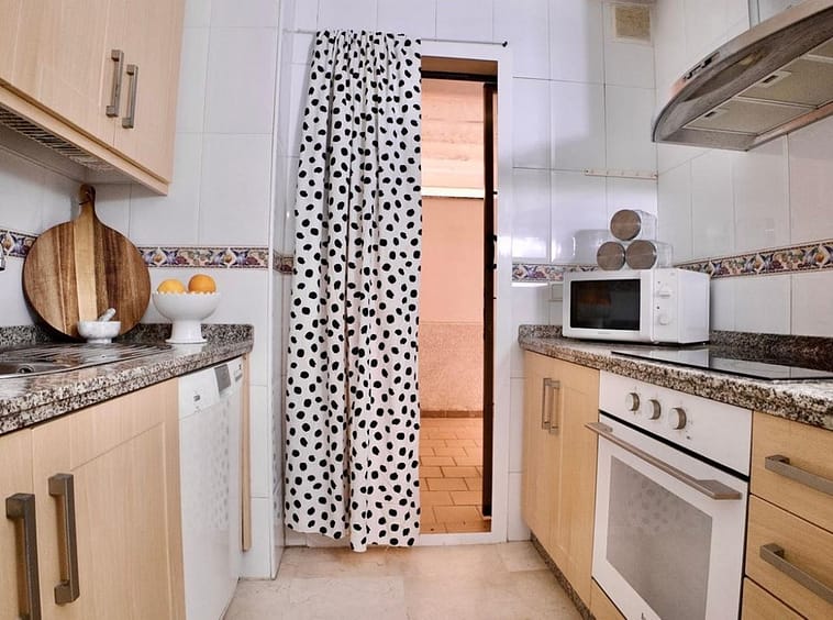 The property features a separate kitchen, a living room, and a bedroom with built-in wardrobes offering ample storage. From the living room, you have access to one of the apartment’s two terraces, with space for a dining table and chairs — ideal for outdoor meals or relaxing.