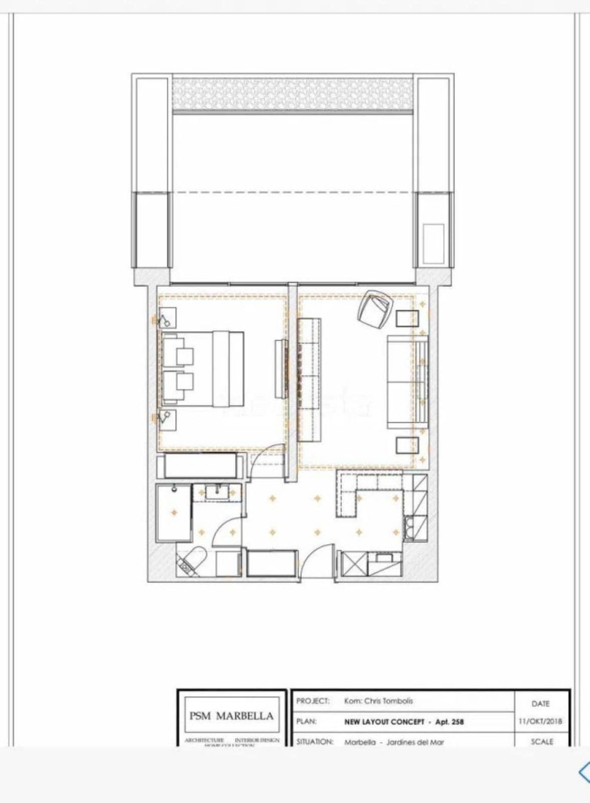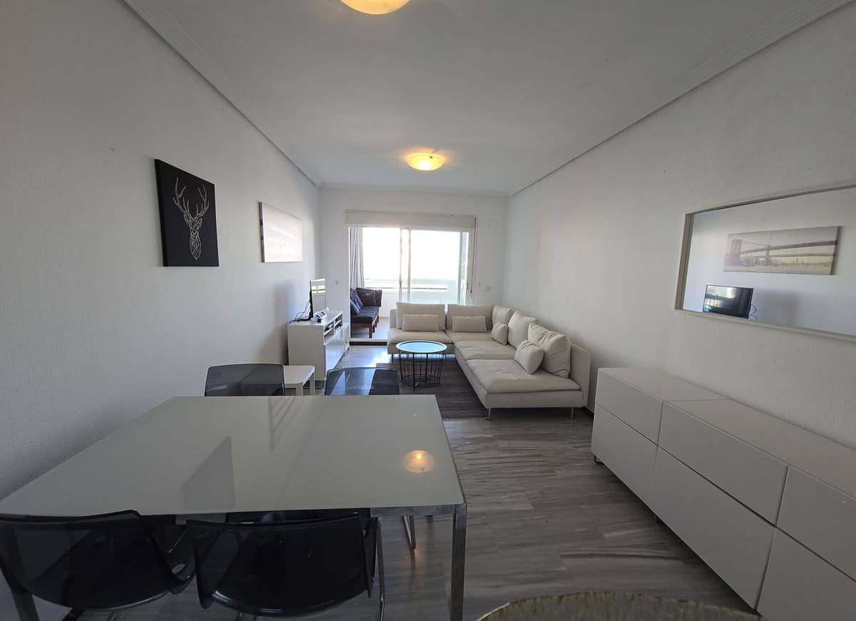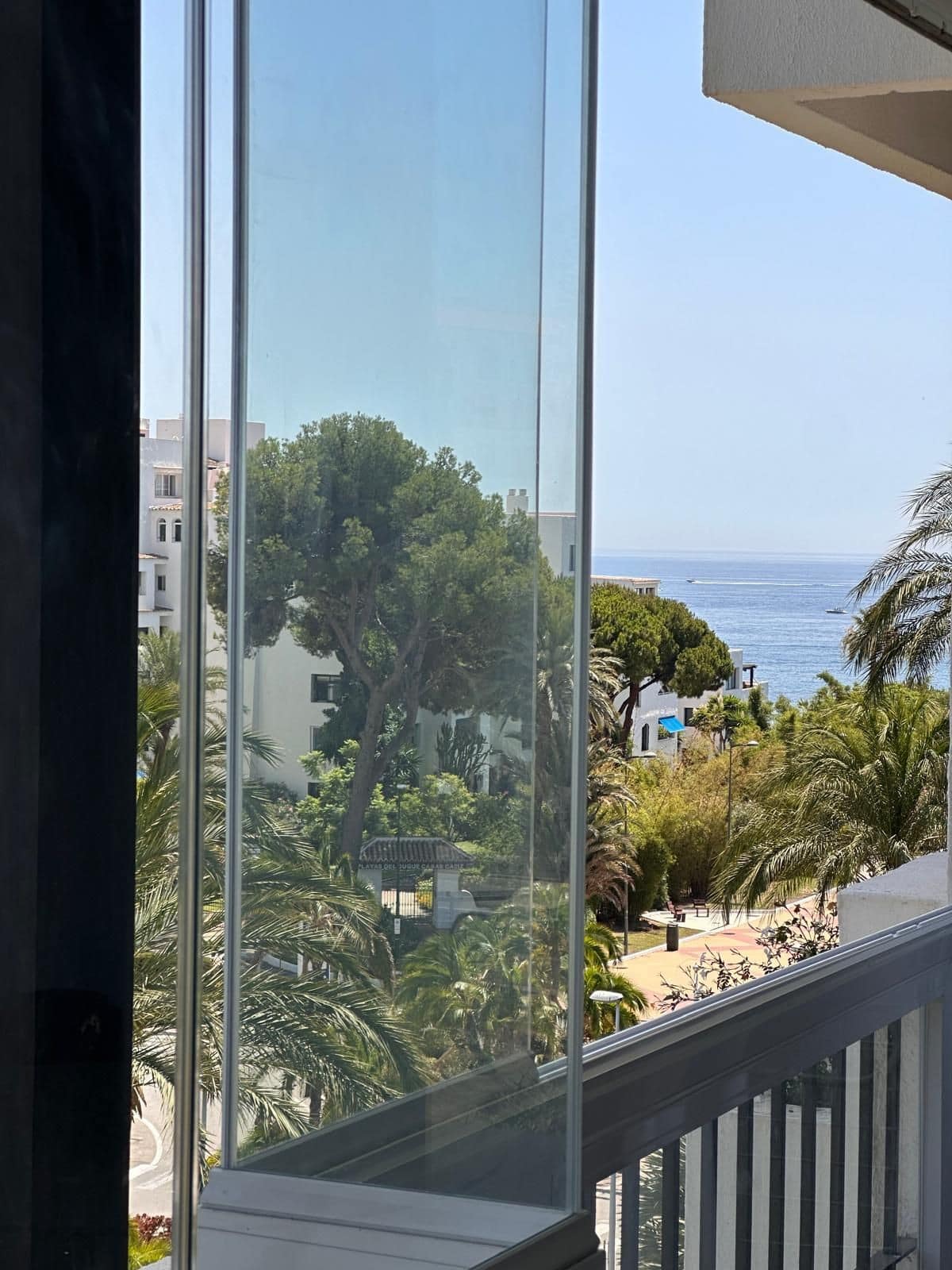 Renovated apartment for sale. One bedroom, brand new bathroom, American kitchen with plenty of storage space, two built-in wardrobes, hot/cold air conditioning and electronic radiators. Smooth paint. Indirect lights adjustable in intensity and perimeter recess to create atmospheres. Very bright. Camouflaged designer sockets. On the terrace, a room for a washing machine and storage has been built. It has a washer-dryer. Electric awning. The apartment has 58 useful square meters and the terrace 30 useful square meters. Brand new hot water heater. Water is not paid for, it is included in the community fee. Possibility of making a second bedroom since the square footage of the house is large. Quiet urbanization designed by the architect Fernando Higueras, with a tropical garden, with two swimming pools, fountains, an artificial river with fish, frogs, ducks.. . IT HAS DIRECT PEDESTRIAN ACCESS TO THE BEACH, without having to cross the road, two showers for when you return from the beach to remove the sand, with direct access to the pool from the beach.