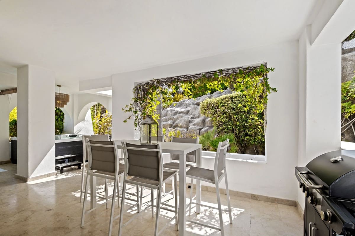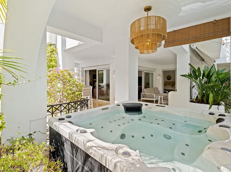 The property boasts a spacious layout of 245 m² with two en-suite bedrooms, a bright open-plan living and dining area, and a modern fully equipped kitchen. Large sliding doors connect the interior to a generous private terrace with a jacuzzi and direct access to lush tropical gardens, creating the perfect setting for entertaining or enjoying the sun all year round.