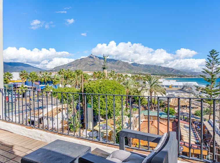 Beautiful penthouse with sea and La Concha mountain views, located in a gated community in the heart of Puerto Banús. Just a few steps from the beach, restaurants, shops, and all amenities. This bright and welcoming property offers an unbeatable location and the perfect combination of comfort and lifestyle. The penthouse features one bedroom and one fully equipped bathroom, as well as a modern kitchen and a spacious living-dining area with a fireplace, filled with natural light. The interior has been designed for both functionality and comfort, and includes centralized air conditioning, shutters, and a pleasant, airy atmosphere. The gated community provides a secure and peaceful environment, ideal for both permanent residence and holiday stays. Additionally, the property offers the possibility of short-term rentals, making it an attractive investment opportunity. An exceptional opportunity to acquire a penthouse in one of Marbella’s most exclusive areas, combining stunning sea and mountain views with a truly privileged location.