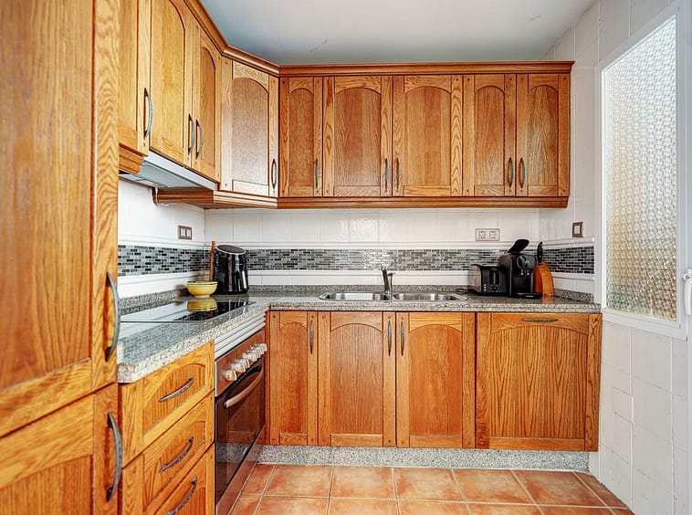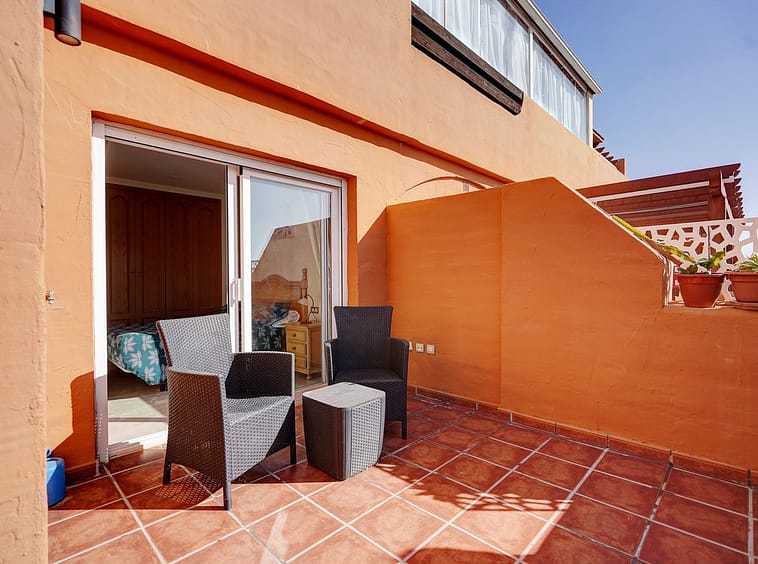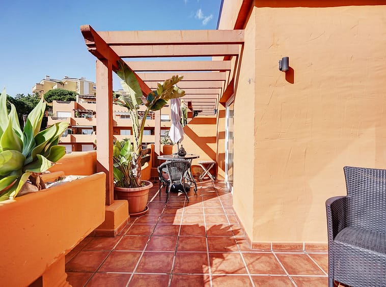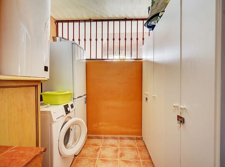 The apartment is generously sized, with a bright living area opening directly onto a large private terrace, also accessed from the bedroom. The spacious double bedroom includes fitted wardrobes and electric blinds, while the full bathroom is well maintained. The independent kitchen, with the option to be opened into the lounge, is complemented by a separate utility room.