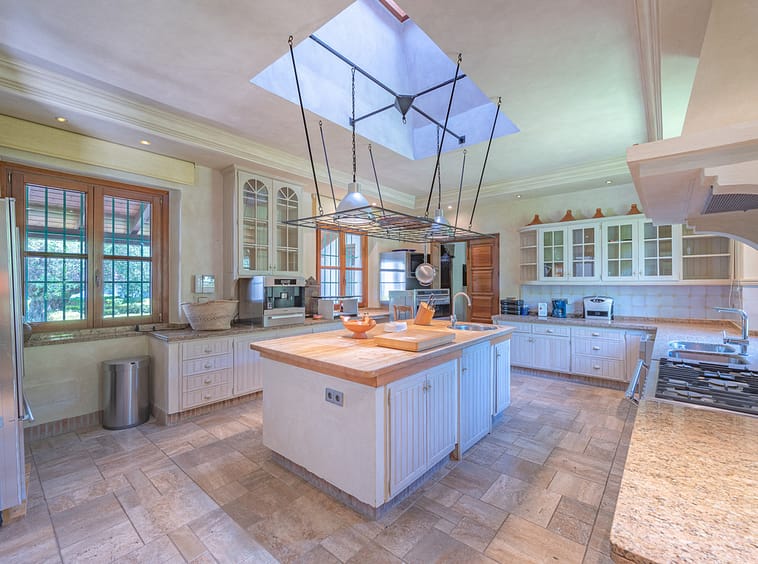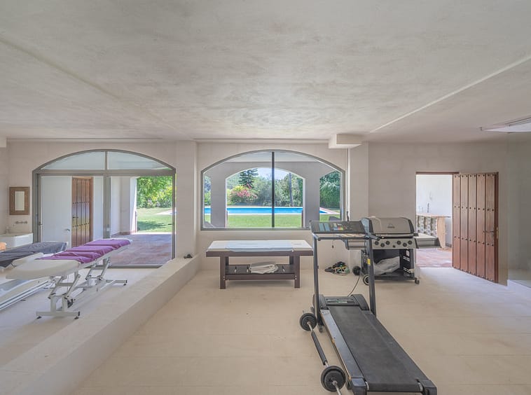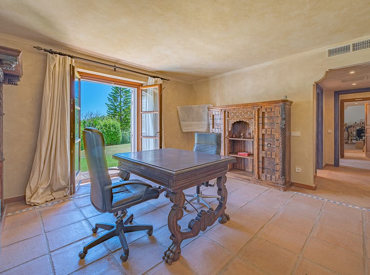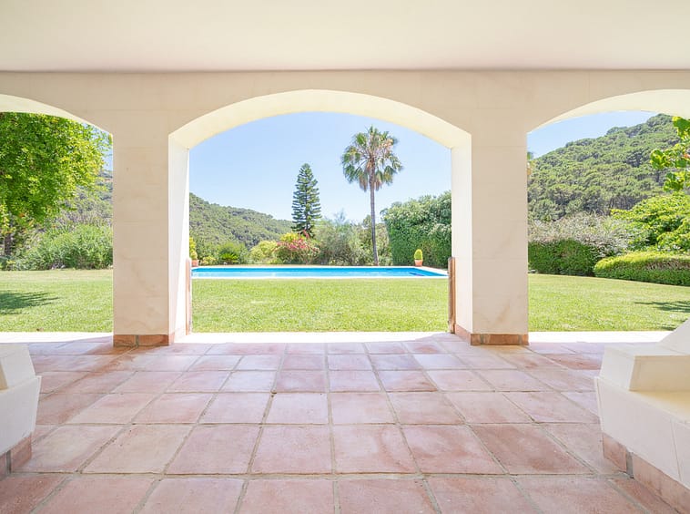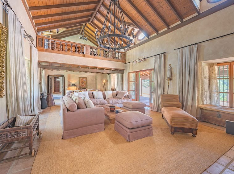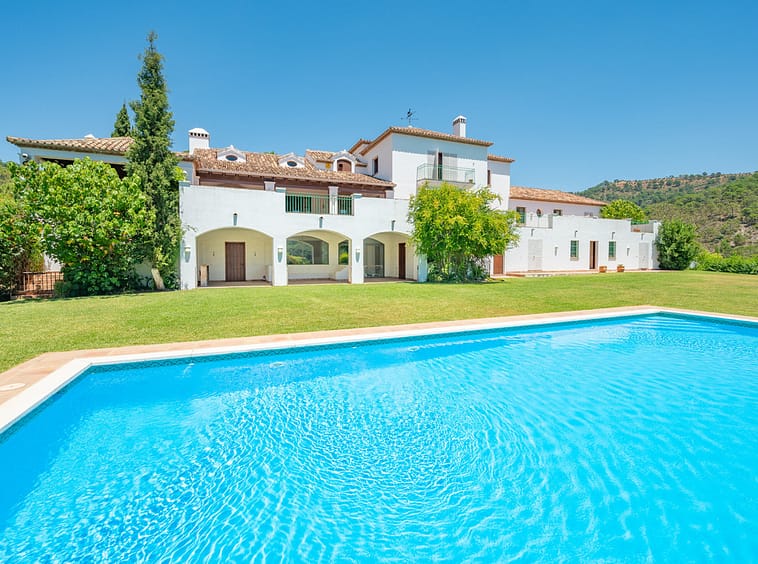 Lovely ten bedroom, south facing country style villa in El Velerin, Estepona, with a large private garden and swimming pool. The property has a large entrance hall; cosy living area with a fireplace and high ceilings; dining room; fully fitted kitchen with island; the master suite; and nine guest suites. There is also a Spa with Jacuzzi and a Gym. Other features include parking for six cars, hot and cold air conditioning and central heating.