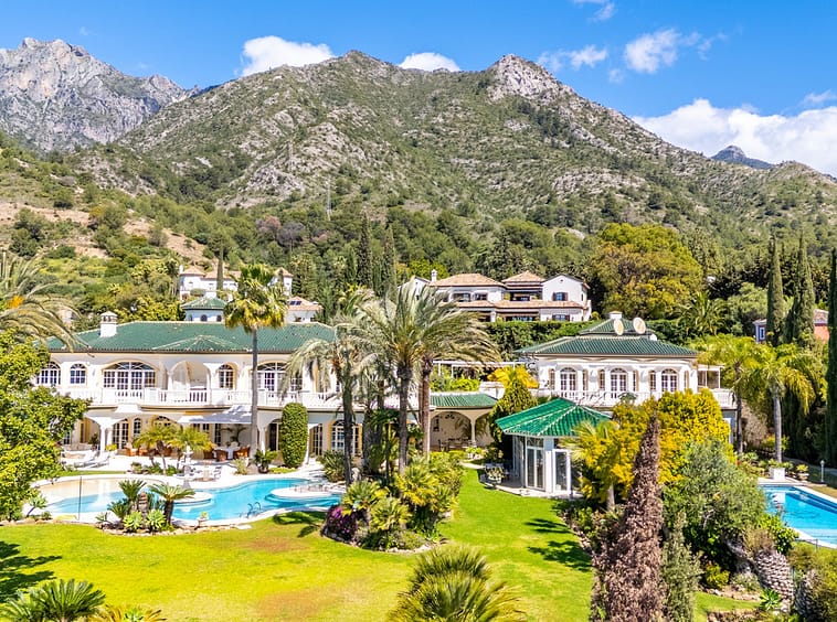 This exceptional property is set on a generous, elevated plot of 7,200 m² in the exclusive, gated Cascada de Camoján community in Marbella and offers breathtaking views of the Mediterranean Sea. The impressive luxury residence consists of three separate properties: the four-bedroom main house, an adjoining, connected seven-bedroom guest house, and a self-contained four-bedroom guest finca with its own tennis court.