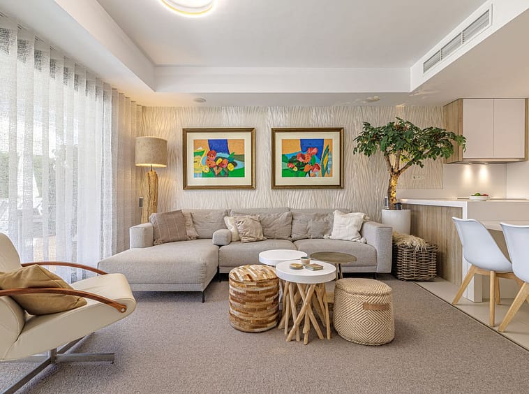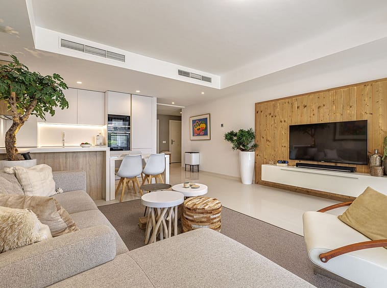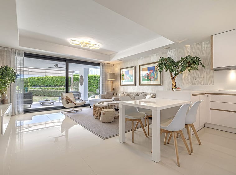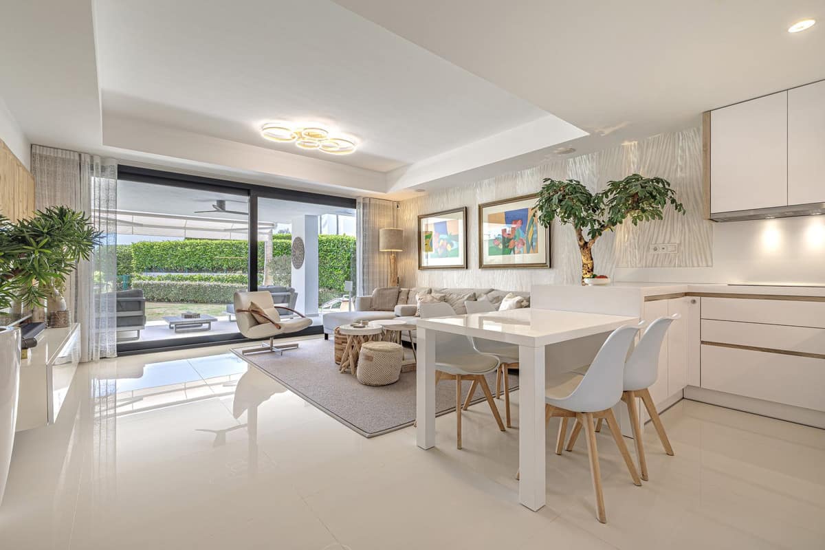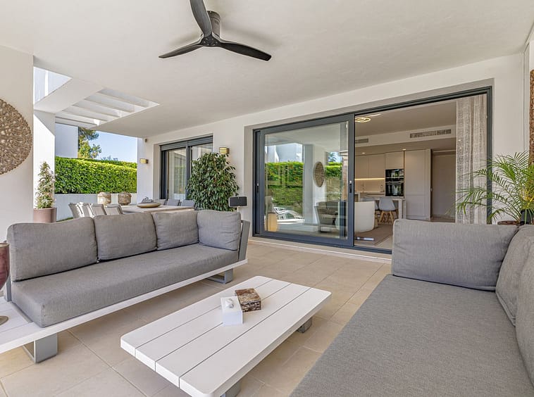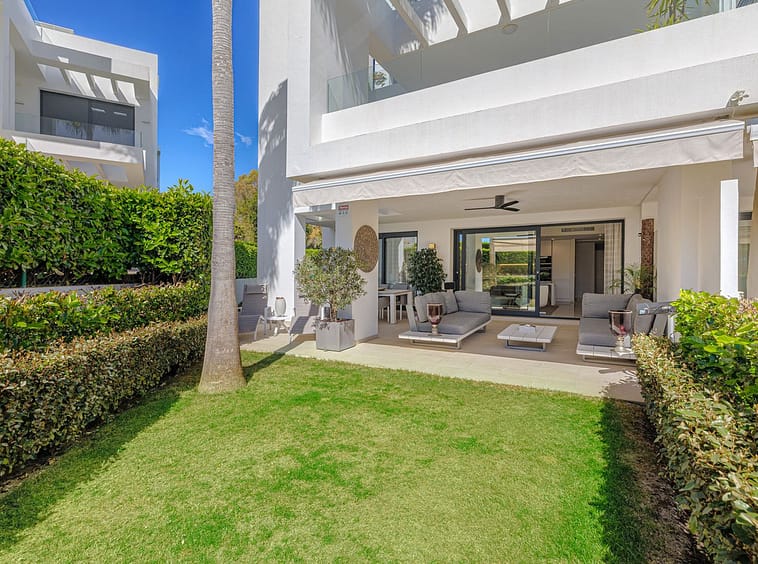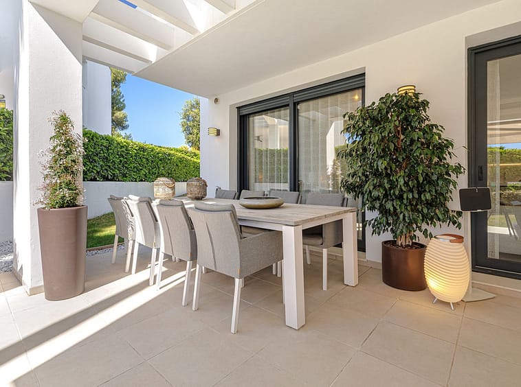Corner ground-floor apartment with 2 bedrooms and 2 bathrooms (one en suite) featuring a spacious, sunny private garden of 122 m² in Las Terrazas de Atalaya.