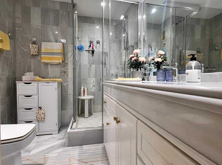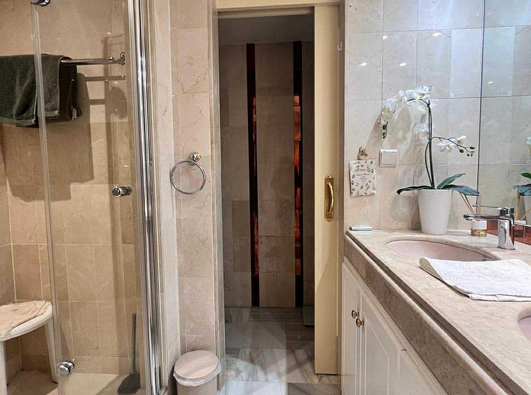 The bedrooms have built-in wardrobes. Everything is perfectly maintained and fitted with timeless materials, including lots of marble in the bathrooms with spacious showers.