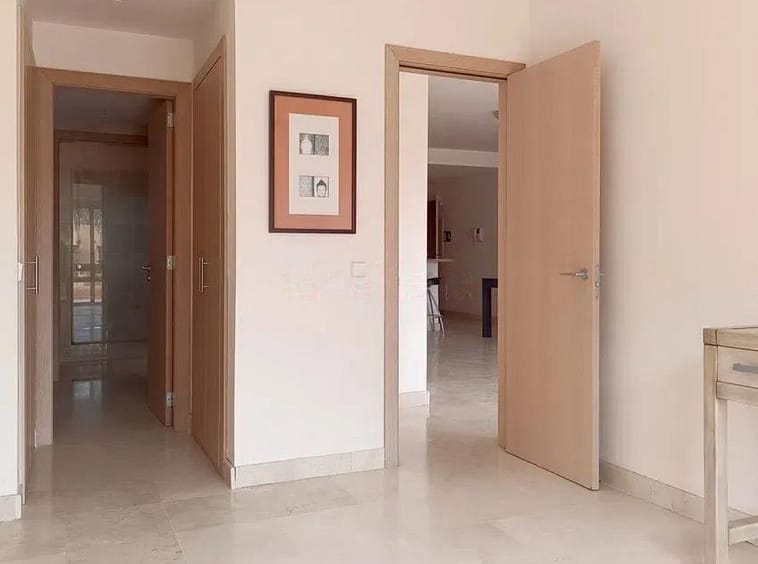 The property has two bedrooms with built-in wardrobes, a spacious living room with plenty of natural light, an open-plan kitchen with a laundry area, and a large private terrace. The master bedroom has an en-suite bathroom with a whirlpool bath. The living room and master bedroom open onto a large terrace where you can relax with family and friends, overlooking the communal pool and gardens.