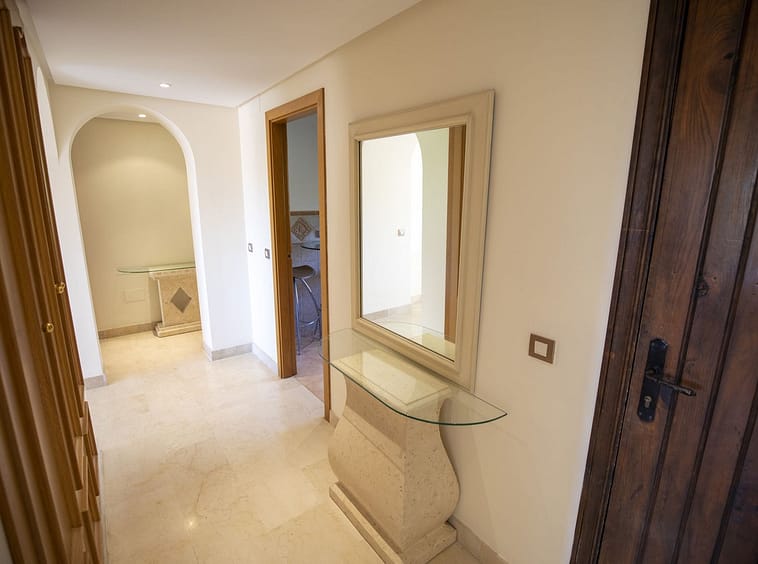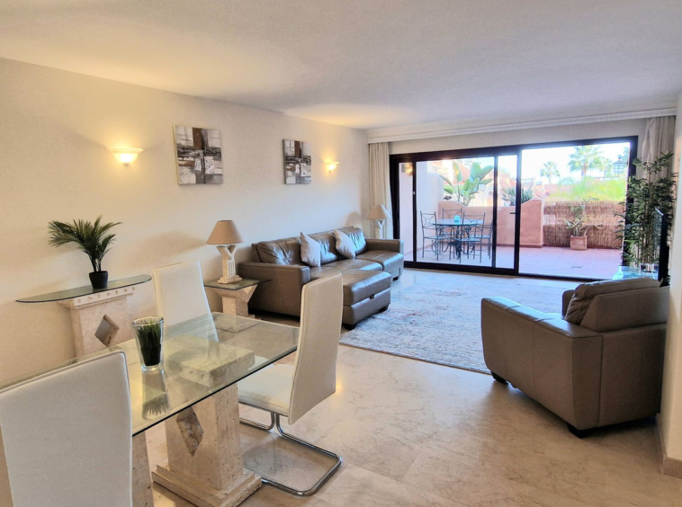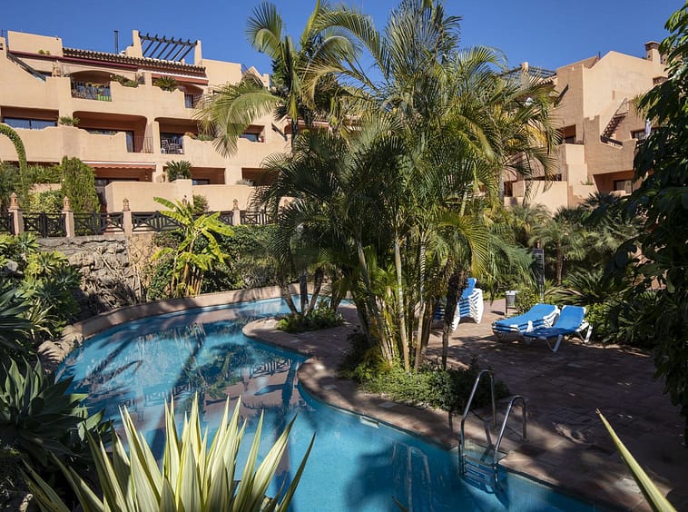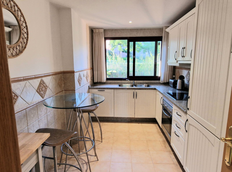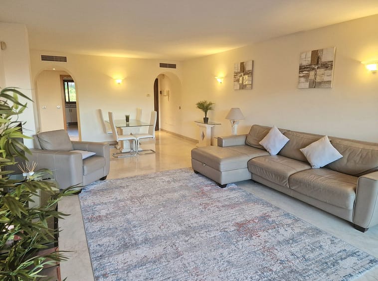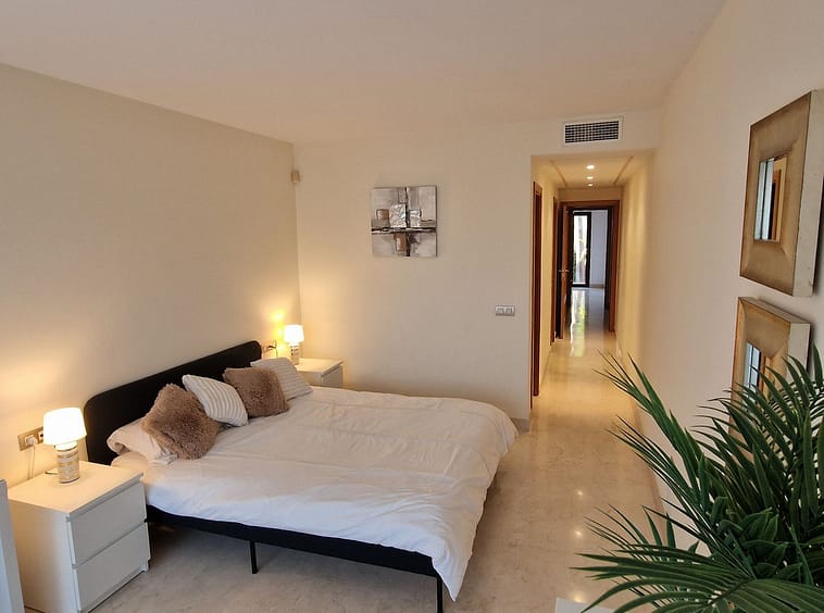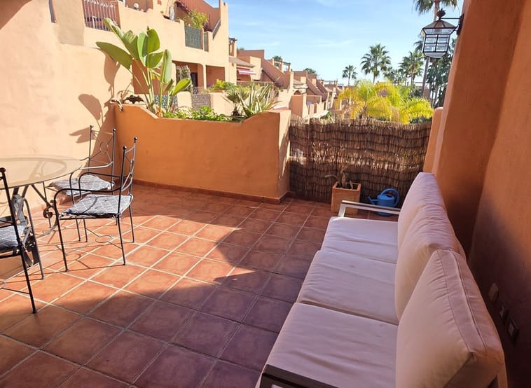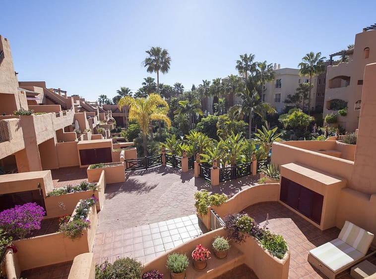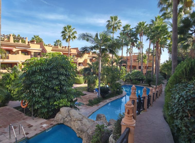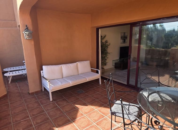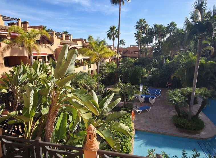 This lovely complex situated next to the wonderful Los Flamingos golf course is a perfect location for a holiday home or rental investment. With shops and restaurants just a 2 minute drive away, Albaicin complex boasts tropical gardens and a unique pool area. The apartment situated on the 1st floor is bright and airy with great views to the pool and gardens. Large living area with a terrace from the living room and mater bedroom. Fully equipped kitchen, hallway with storage area. 2 large bedrooms with master offering a walk in closet and en suite bathroom. Bedroom 2 also has a small terrace and plenty of cupboard space. with bathroom next door. The elevator takes you directly to the garage where you also have a storeroom. This is a great opportunity to live in a luxury development in between Marbella and Estepona.