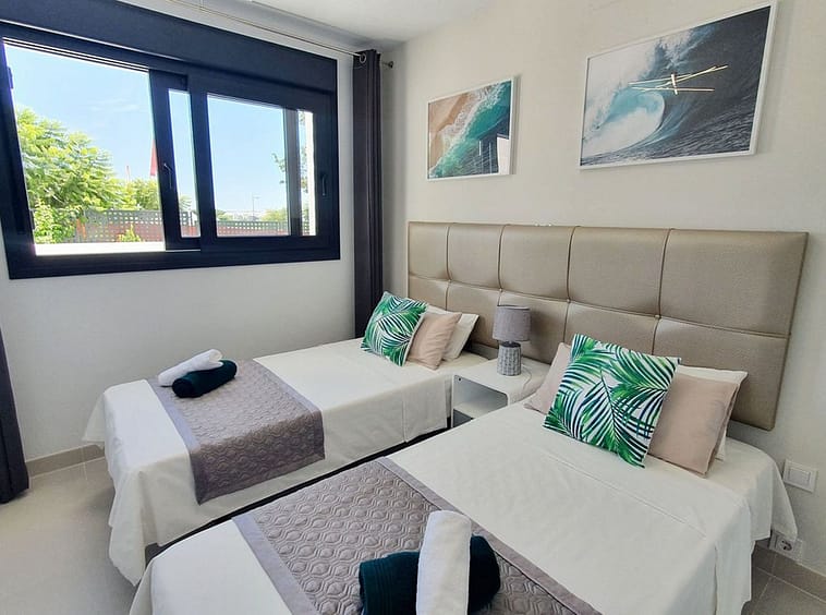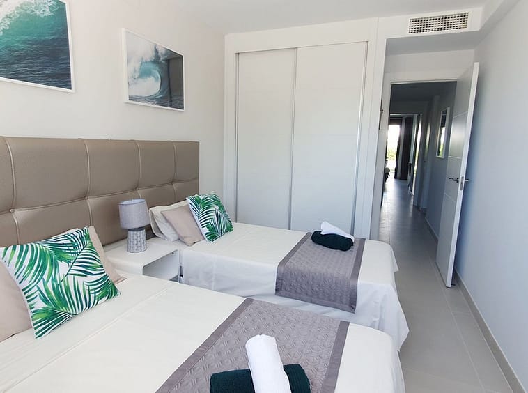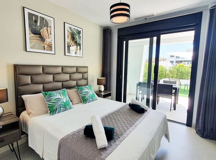 The garden connects directly to the tranquil communal areas featuring beautifully landscaped Mediterranean gardens, swimming pools, jacuzzis, and a children’s play area.