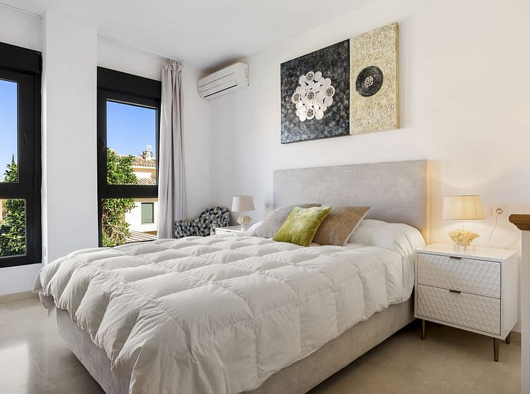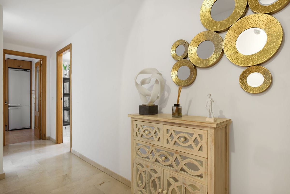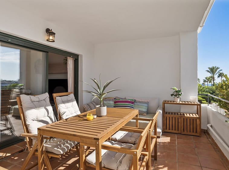The apartment itself features a spacious living room that opens directly onto a west-facing terrace with open views, ideal for enjoying sunsets and outdoor dining. The master bedroom includes an en-suite bathroom, while the second bedroom and bathroom provide comfortable space for family or guests. The home also boasts a fully equipped kitchen with a utility room for extra practicality.