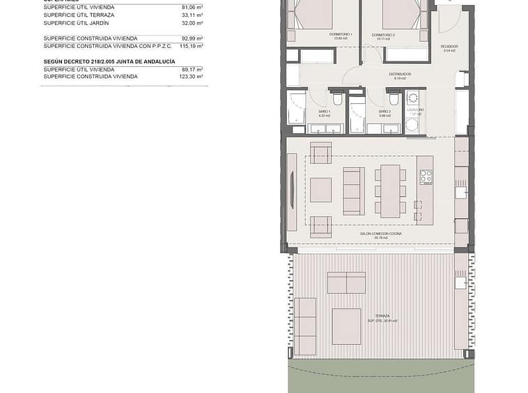 The apartment features 92 m² built, distributed into 2 bedrooms and 2 bathrooms, a fully fitted kitchen with Siemens appliances, independent Airzone climate control per room, and underfloor heating powered by aerothermal energy.