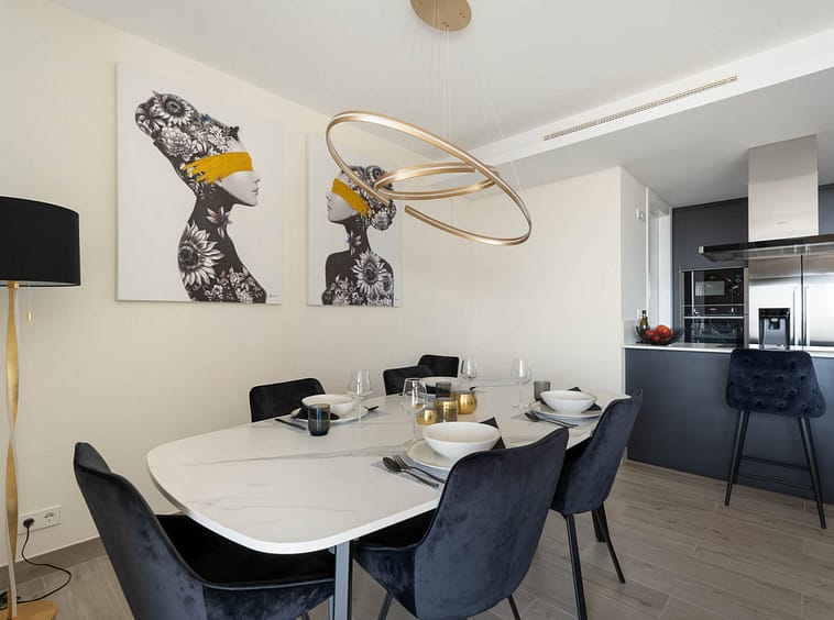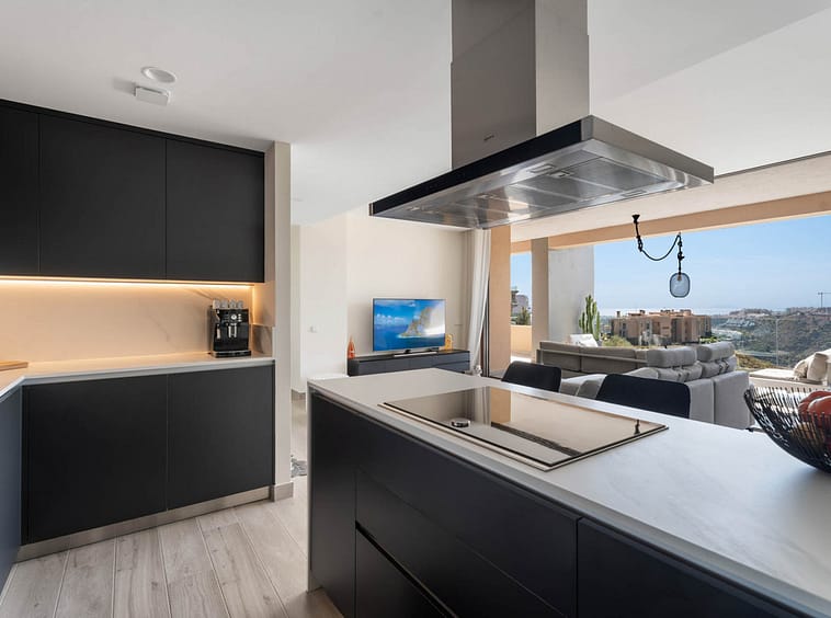 The open-plan layout connects the kitchen, dining, and living areas, creating a fluid interior space that extends onto a spacious southwest-facing terrace. From here, panoramic sea and mountain views provide an inspiring backdrop, with sunlight throughout the day and striking sunsets in the evening.