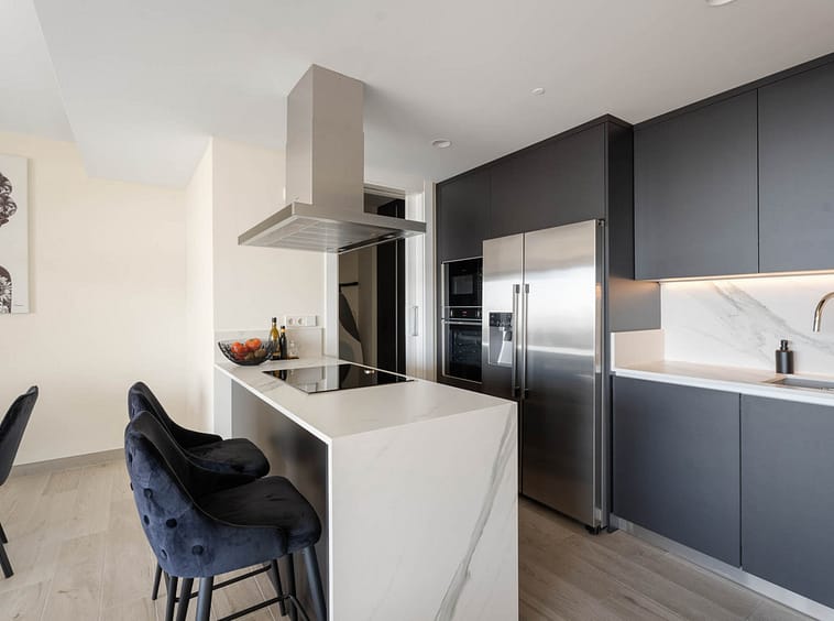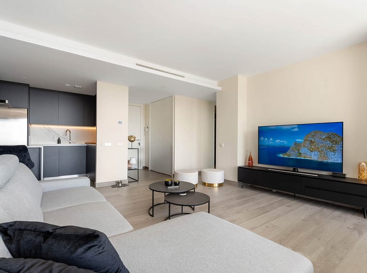 The kitchen is fully equipped with high-end appliances and clean, modern finishes. Both bedrooms have been designed for comfort and privacy, featuring fitted wardrobes and large windows. The primary suite includes an en-suite bathroom and direct terrace access, while the second bedroom enjoys natural light and a nearby bathroom.