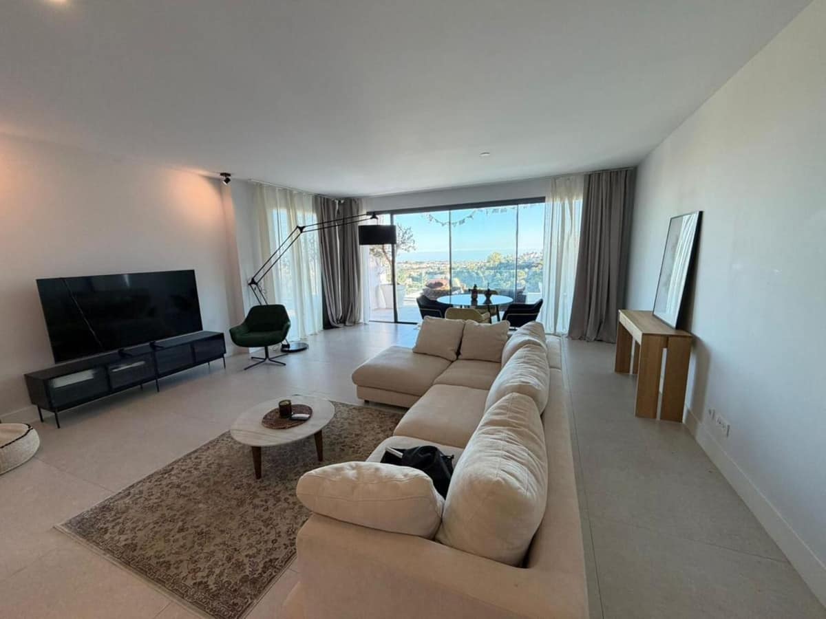 The property features a bright and spacious open-plan living and dining area with direct access to a generous private terrace, offering breathtaking panoramic views of the Mediterranean Sea, golf courses, and surrounding natural landscape. Floor-to-ceiling windows allow abundant natural light and create a seamless connection between indoor and outdoor living.