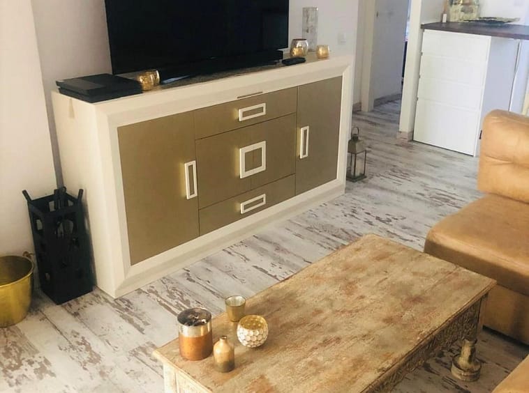 Living room, with bed sofa, custom furniture and a fireplace. Fully fitted open kitchen, recently renovated, with high quality appliances.