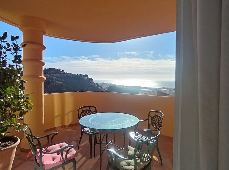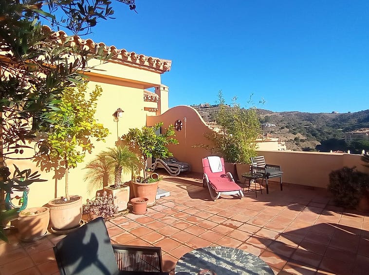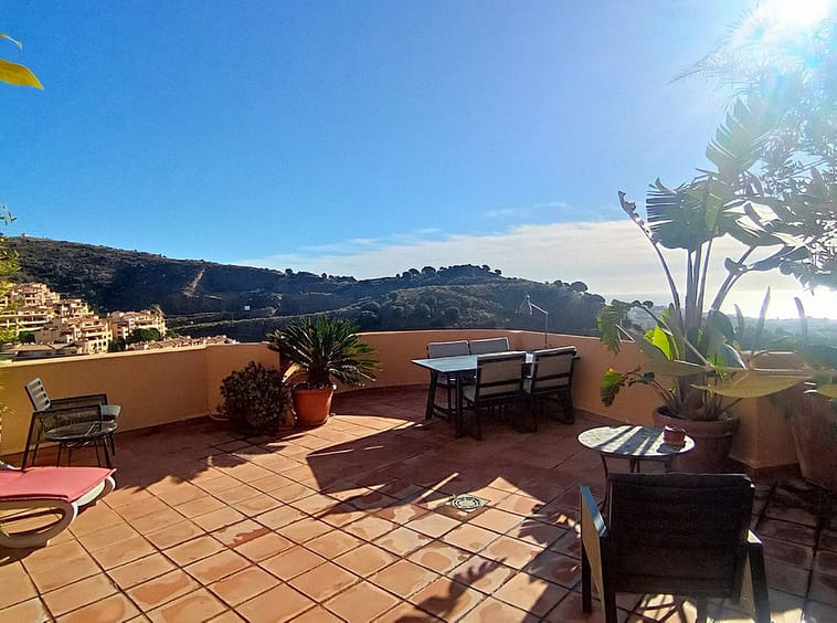 Stunning terraces with sea and mountain views. Over 60 square meters of covered and uncovered terraces. Immaculate two-story penthouse. Built-in interior staircase provides access to the upper level. The ground floor comprises two bedrooms and two full bathrooms, while the upper floor features a bedroom with a guest toilet. Terraces, views, and tranquility await. The complex boasts two pool and garden areas, as well as ample communal parking. The apartment is being sold almost fully furnished. Underground parking is available in the adjacent complex. The upstairs bedroom is more of a small living room, as it serves as a passageway to the large terrace. This is why we have listed three bedrooms.