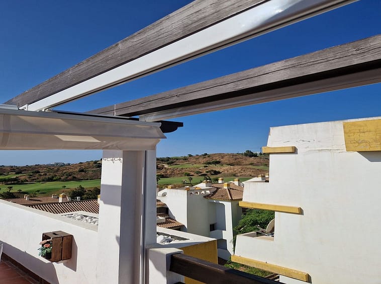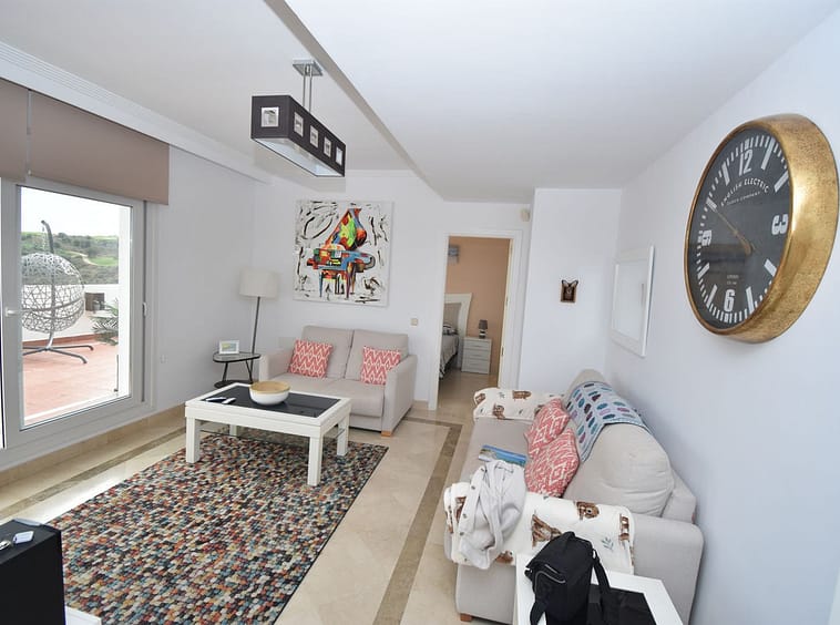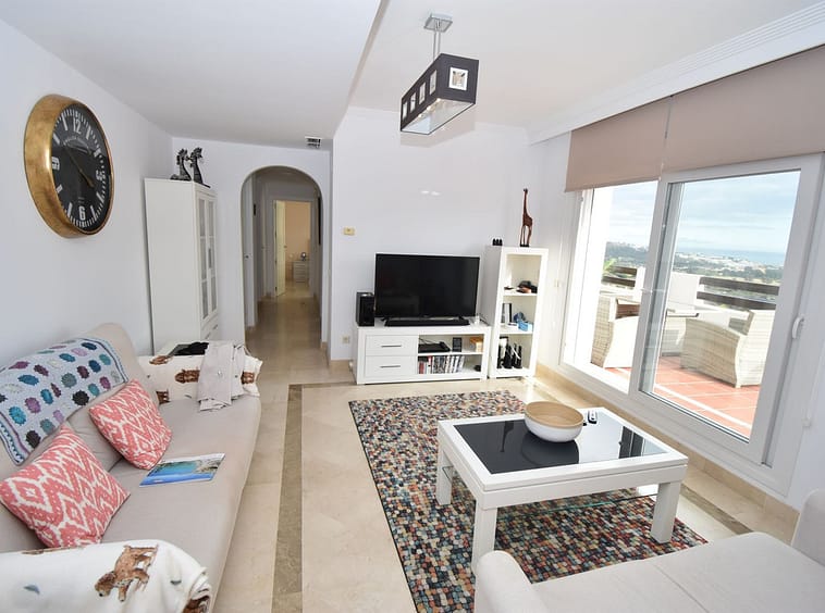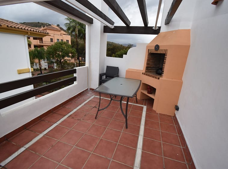 Presented in excellent condition, the penthouse features a fully fitted kitchen, elegant marble flooring and fitted wardrobes. The spacious living area opens seamlessly onto a vast private terrace, ideal for outdoor dining, entertaining, or simply relaxing while enjoying the spectacular views over the golf course, mountains, countryside, and communal gardens. A built-in barbecue makes the terrace perfect for year-round enjoyment.