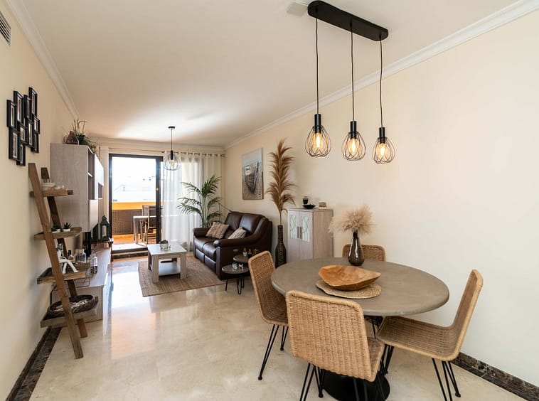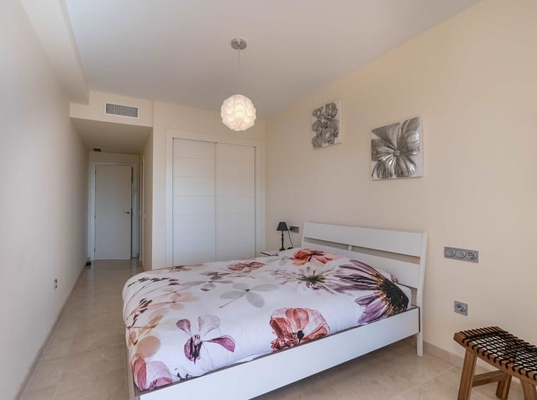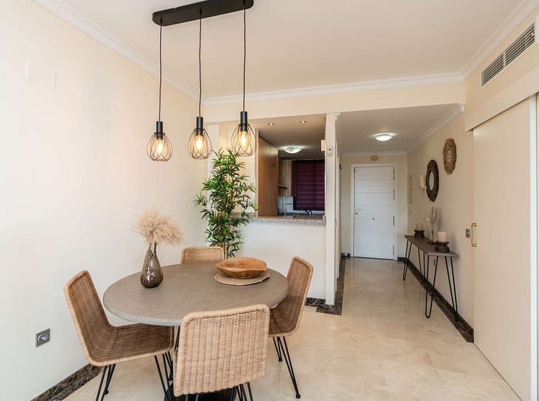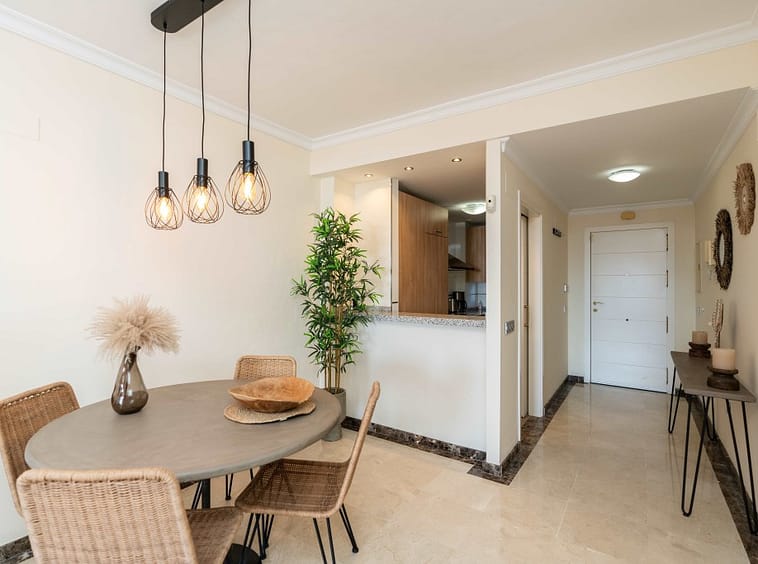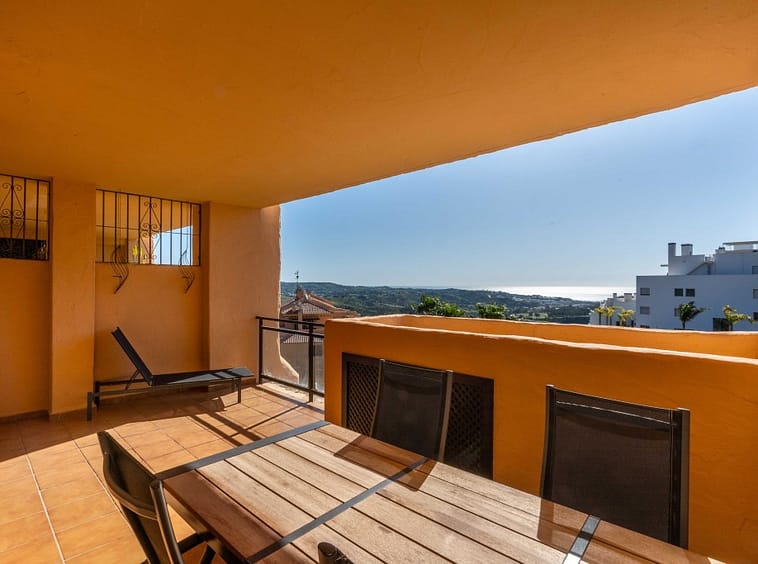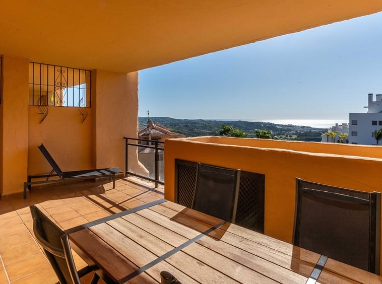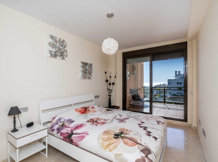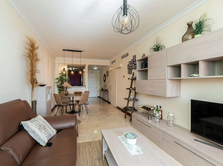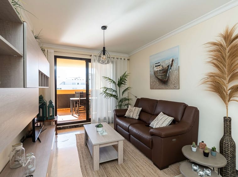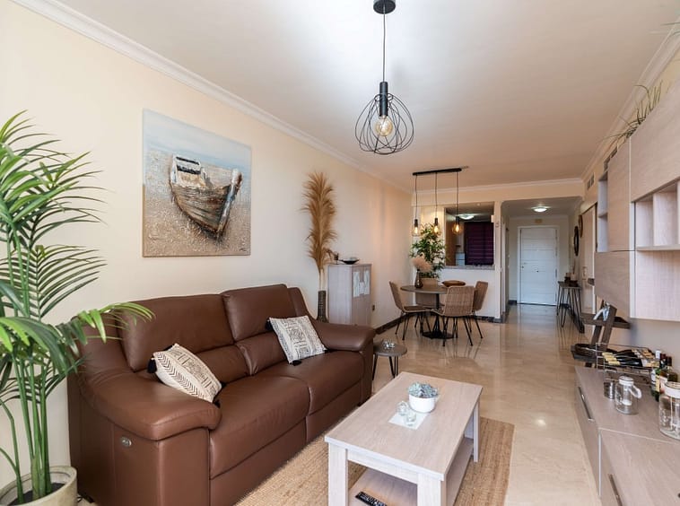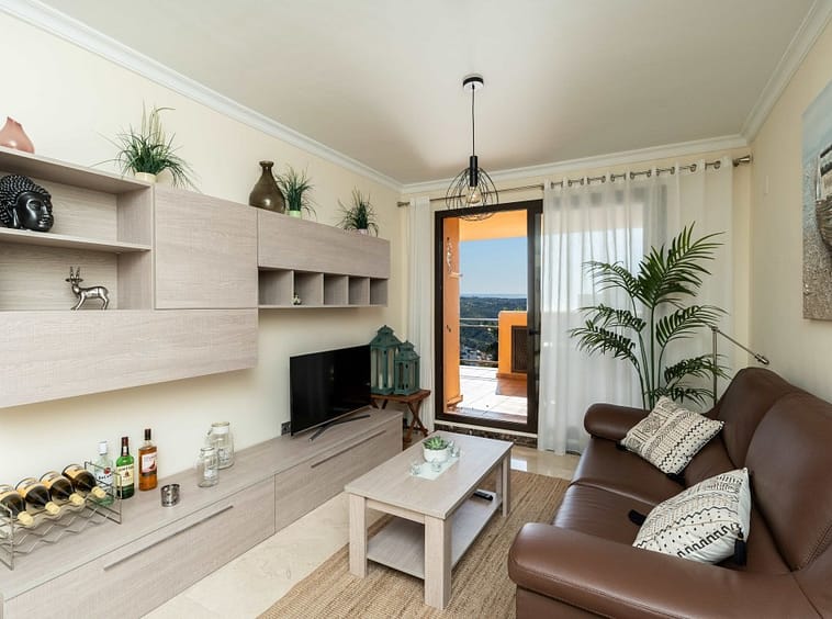 Stylish 2-bedroom, 2-bathroom apartment in the sought-after Calanova Sea Golf complex in La Cala de Mijas. It features a bright living room with access to a 22 m² terrace, fully equipped kitchen, modern furniture, underground parking
