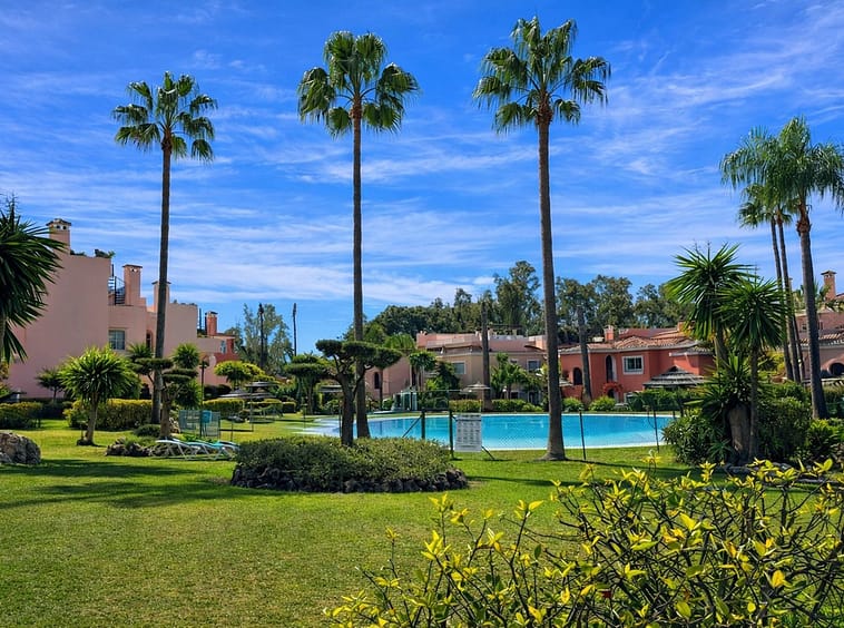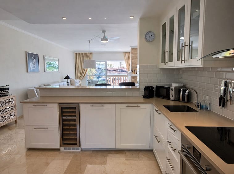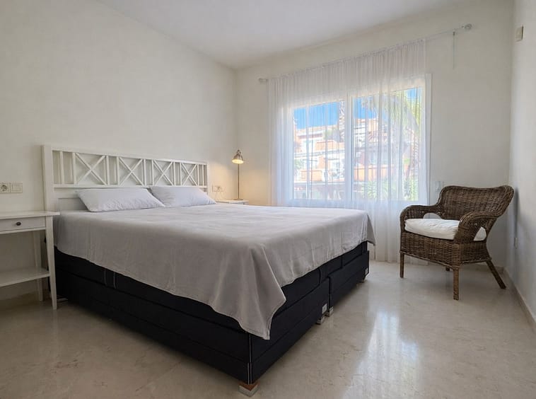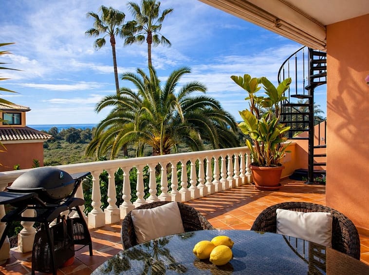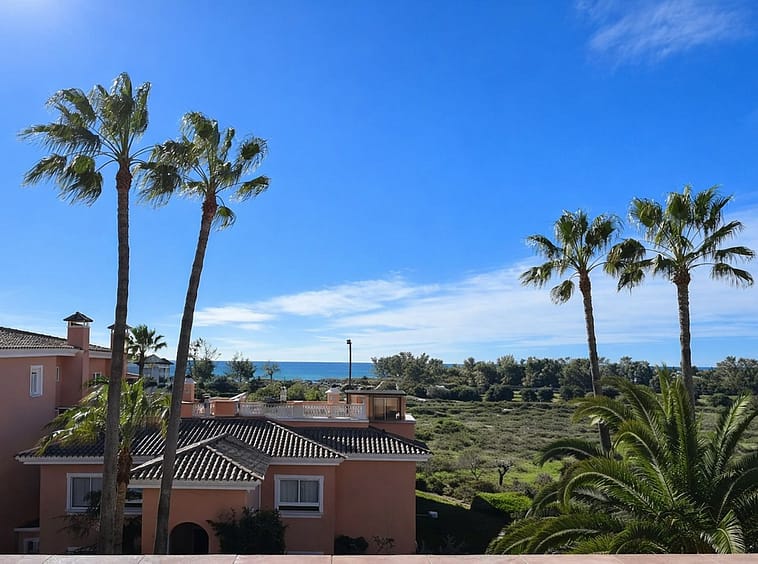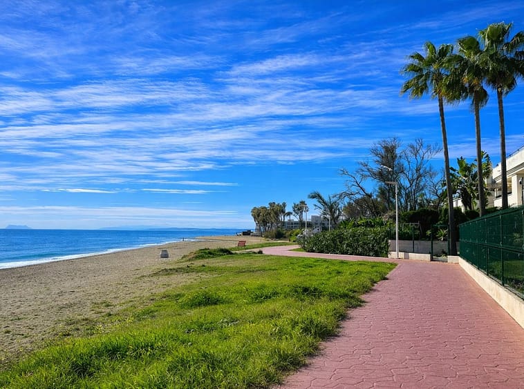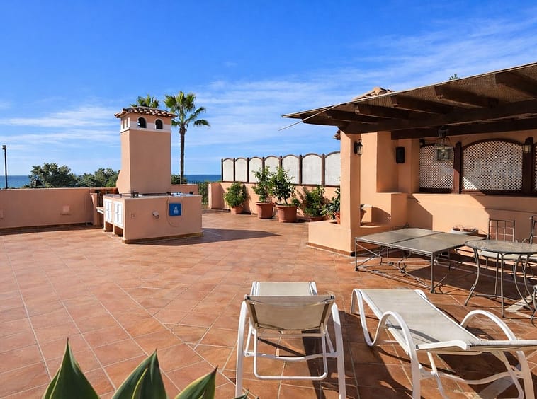 Beachside Duplex Penthouse on the New Golden Mile, a great opportunity to purchase a spacious beachside duplex penthouse in a prime location, just a few minutes walk from the beach promenade. The property offers spacious accommodation with bright open plan living, two large bedrooms (including a master bedroom with en-suite bathroom), and outdoor space with terraces enjoying sea views. The fully fitted kitchen has been recently renovated and there is an adjacent laundry room. The upper level features a large private rooftop terrace, offering privacy, sea views, and plenty of space for outdoor dining and entertaining. The penthouse is sold with an underground parking space and a private storage room. The gated urbanisation has mature landscaped gardens and well maintained communal areas, creating a perfect beachside environment.