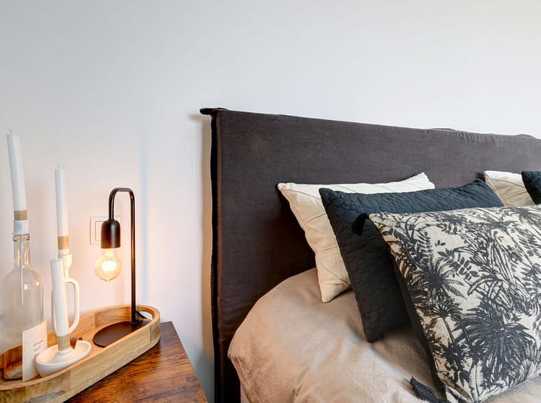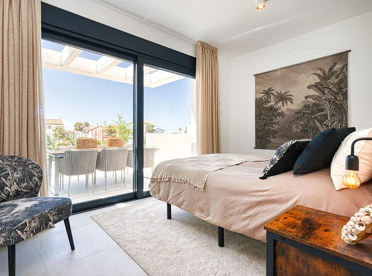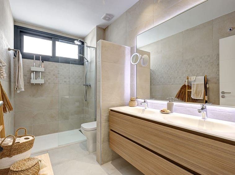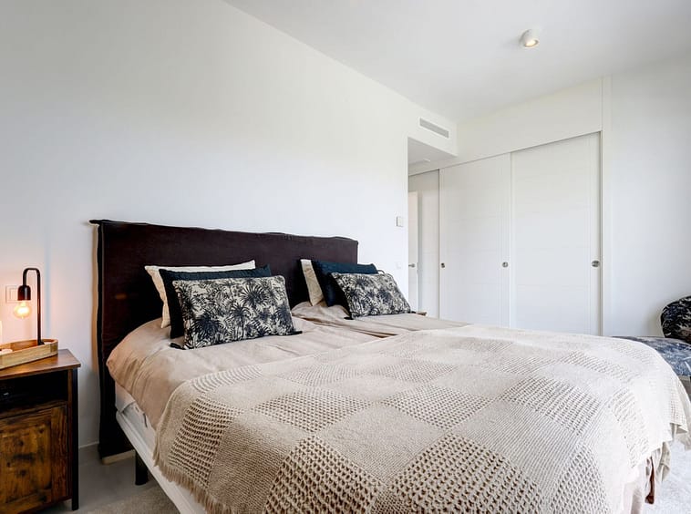 The master bedroom includes an en-suite bathroom, large built-in wardrobes, and direct access to the terrace, allowing natural light and cross ventilation. The second bedroom is also spacious and features built-in wardrobes. Both bathrooms are finished with high-quality materials and a functional yet elegant design.