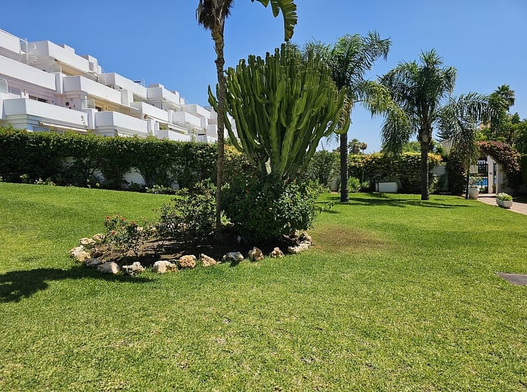 Further down the hallway, a fully fitted kitchen sits on the left, complete with access to a second, 11m2 garden space—perfect for morning coffee. Thanks to its south-facing orientation, the apartment remains light-filled throughout the day, creating a welcoming and cheerful atmosphere. Location is another standout—just 15 minutes from Marbella and Estepona, and between 4 to 8 minutes from El Paraiso and Atalaya Golf clubs. It's a mere 10 to 15-minute stroll to the beach, with shops, restaurants, and essential services only steps away.