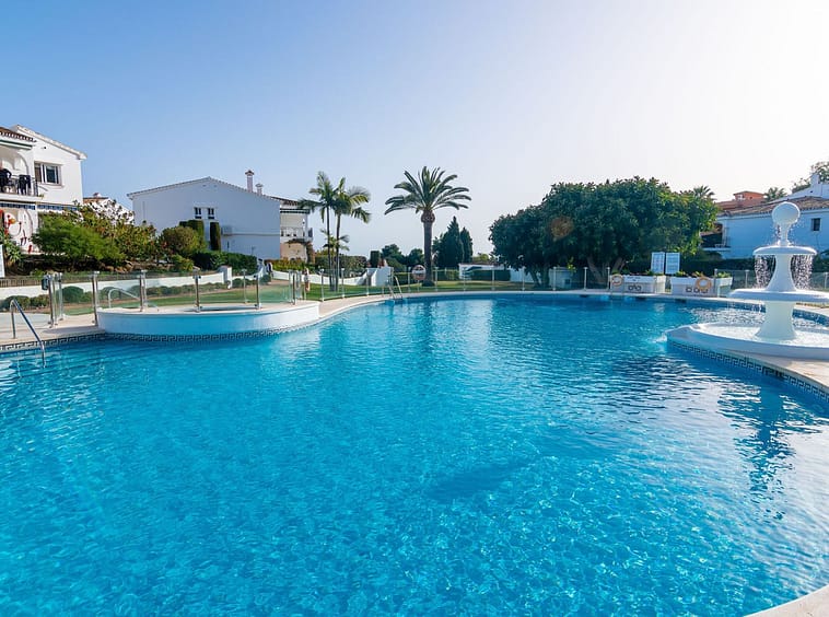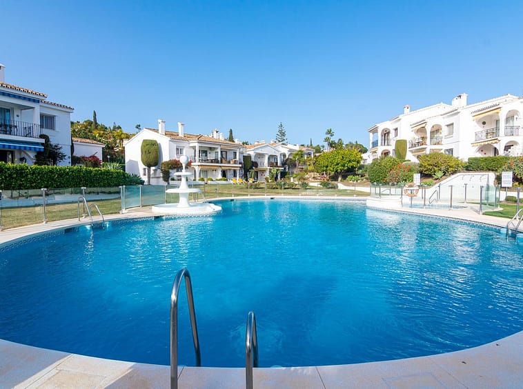 The community offers a well maintained residents swimming pool and tropical palm gardens expertly decorated with tall palm trees, colourful bougainvillea and Andalucían Roman garden features, designed within its exquisite tiled pathways decorating the community throughout.