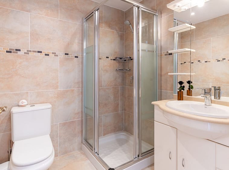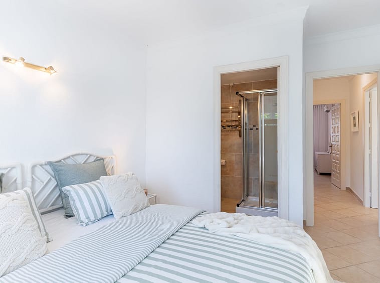 The double guest bedroom is accessed from a long private corridor and offers 2 single beds, wall to wall elegant white net curtains and double integrated sliding wood panelled wardrobes. Adjacent fully renovated spacious guest bathroom with contemporary tiling, marble top vanity unit and integrated ceiling spots.