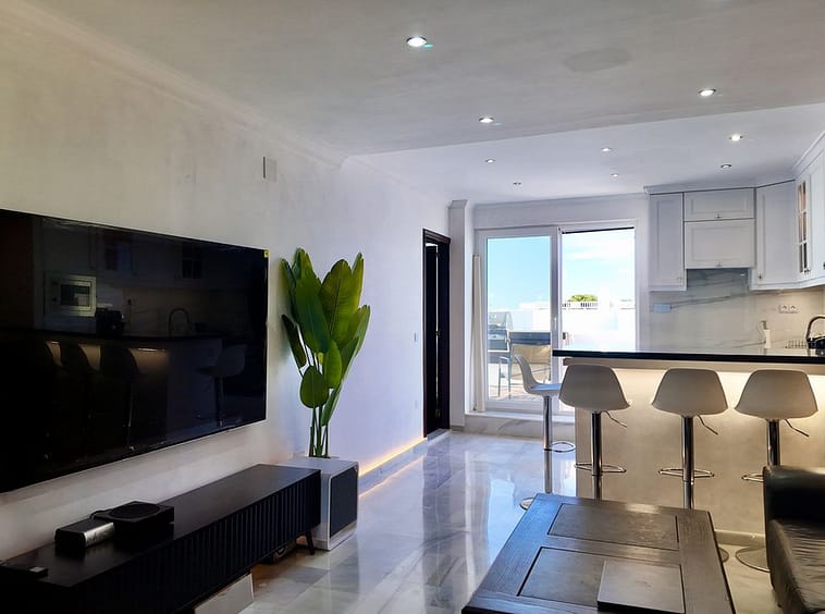 A fully renovated duplex penthouse with panoramic sea views, La Concha and Gibraltar for under €400,000 is a rare opportunity in Marbella.