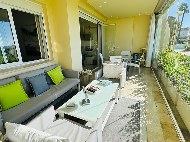 Frontline beach apartment for sale in Elviria, Marbella. Rare opportunity to acquire a frontline beach property in the very exclusive area of Elviria located 15m drive from Marbella. This 2 bedroom 2 bathroom ground floor apartment is totally renovated modern style and is sold fully furnished. The contemporary open plan kitchen opens to the living room which leads to a covered terrace, equipped with glass curtains which can be opened when needed. The property is very bright and is part of a small very exclusive complexe of 14 apartments only, where all have stunning sea views. It is equipped with double glazing windows and electric blinds, Air conditioning Hot and Cold. The apartment has a private garden included in the title deeds and a private covered parking space. The community garden of 2400m has direct access to the beach. The size of the plot is exceptional for only 14 apartments. The beautifully designed pool, and gardens are all very well maintained. You are allowed to rent short term in this complexe, making the property a great little earner, perfect for an investor.