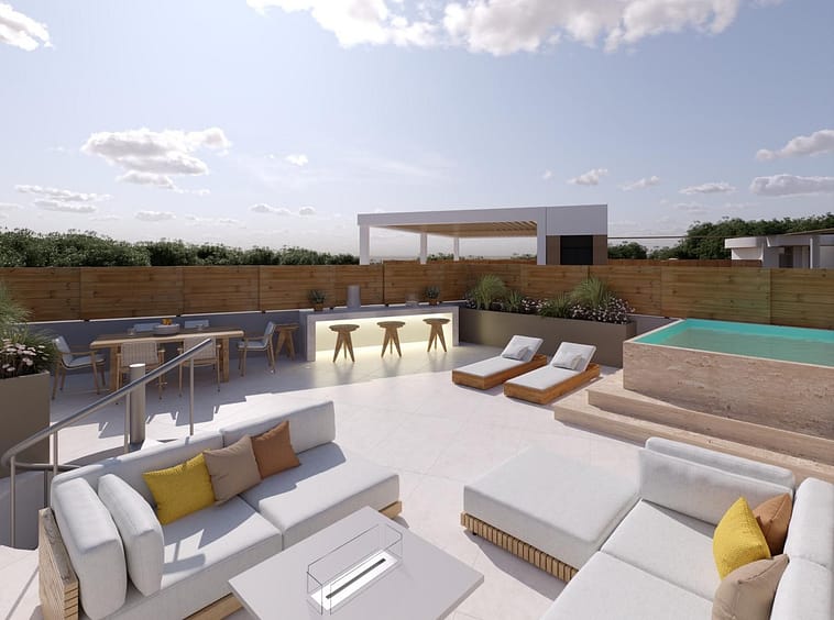 Vivienda 25 impresses with its exclusive rooftop solarium featuring a private plunge pool, offering the ideal space to relax, entertain, and take in panoramic views of Estepona’s skyline. With a total of 61 m² of outdoor space — comprising a 33 m² main terrace and a 28 m² rooftop solarium — this residence epitomizes the Costa del Sol’s indoor–outdoor lifestyle.