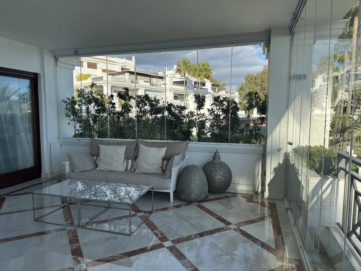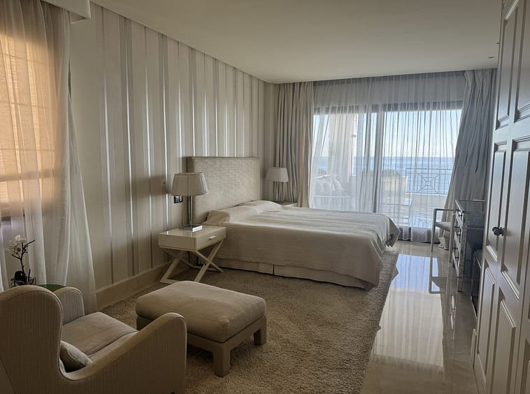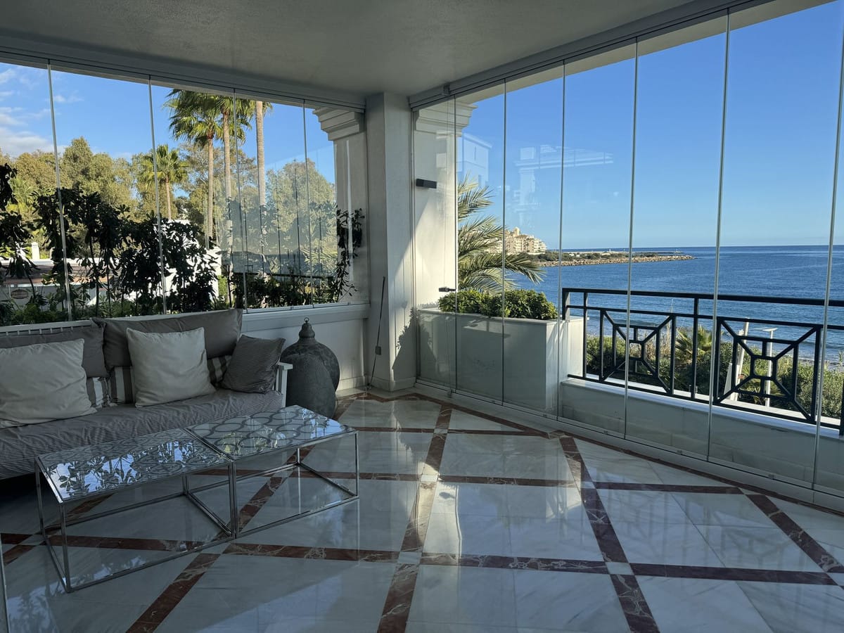 Exclusive beachfront apartment for sale in the prestigious Doncella Beach residential complex, located on the first line of the sea in Estepona, Costa del Sol.