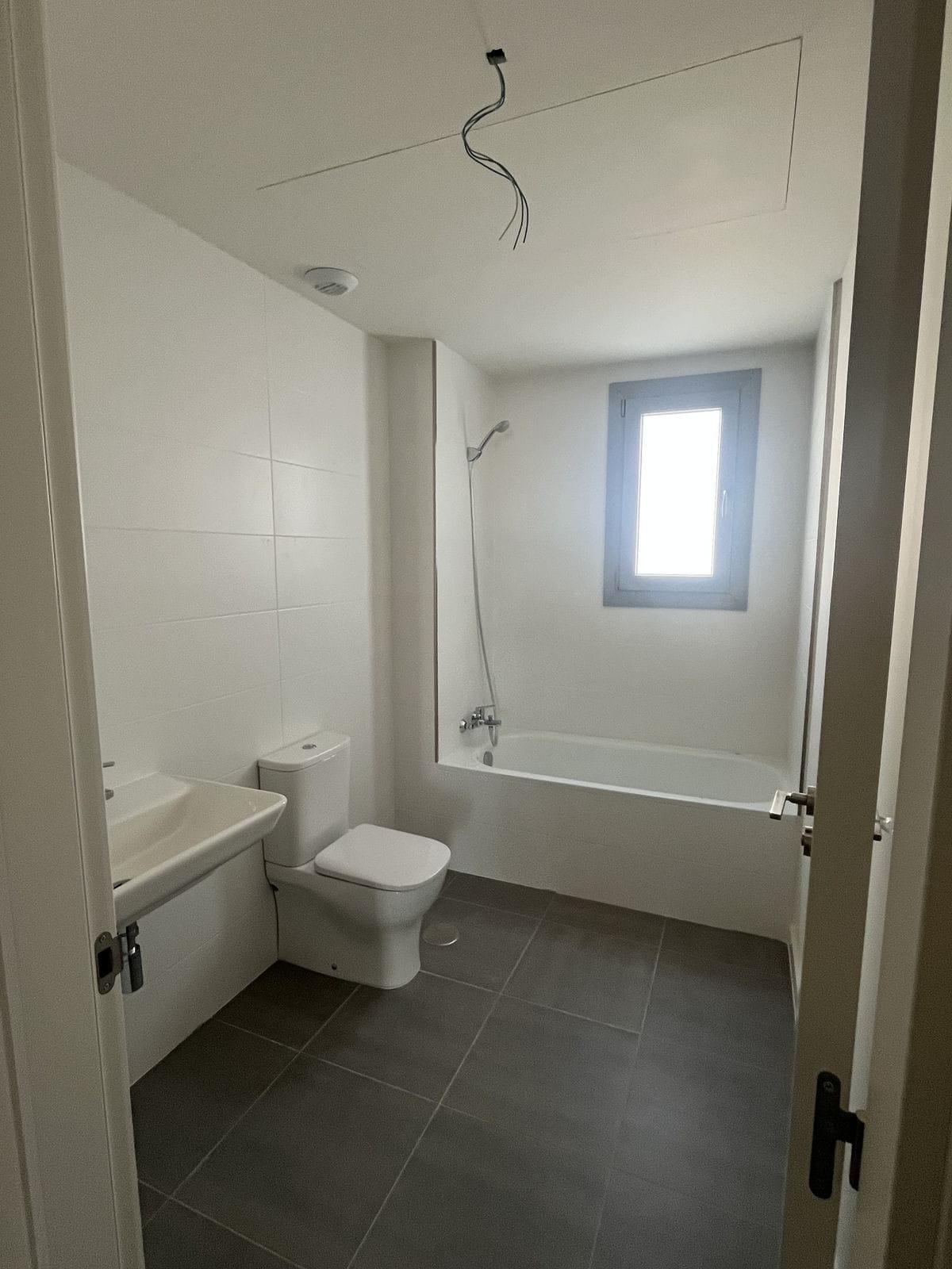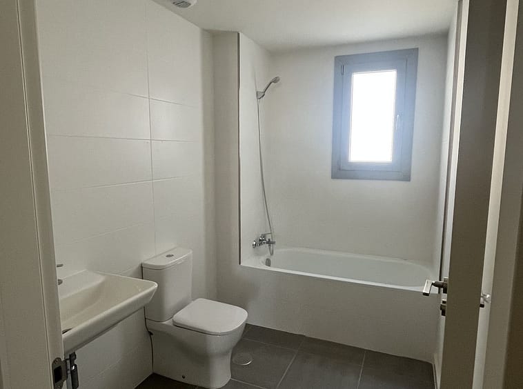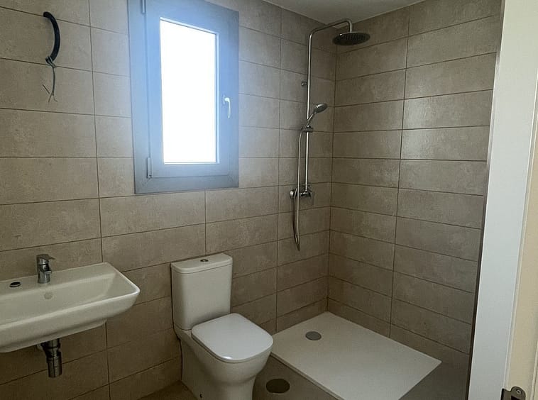 Functional layout – two bedrooms (including a master suite with its own bathroom), a second full bathroom, and a bright open-plan living area connected to the terrace through large glass doors.