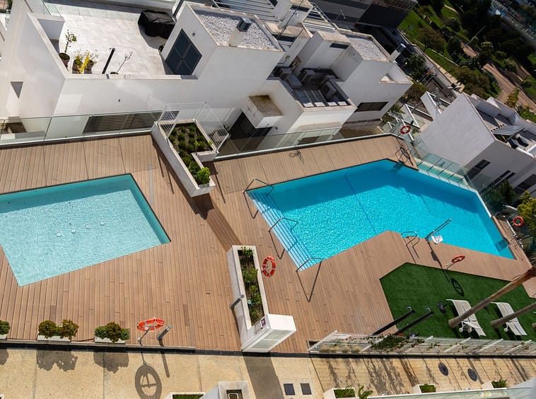 Nestled in a small, exclusive community of only 30 apartments across four low-rise blocks, this penthouse occupies the highest block, guaranteeing maximum privacy and unobstructed views. The community is exceptionally well-maintained, with an excellent financial standing and a welcoming, respectful atmosphere among neighbors. Combined with an onsite pool and fully equipped gym the apartment also includes two large parking spaces and an ample storage room.