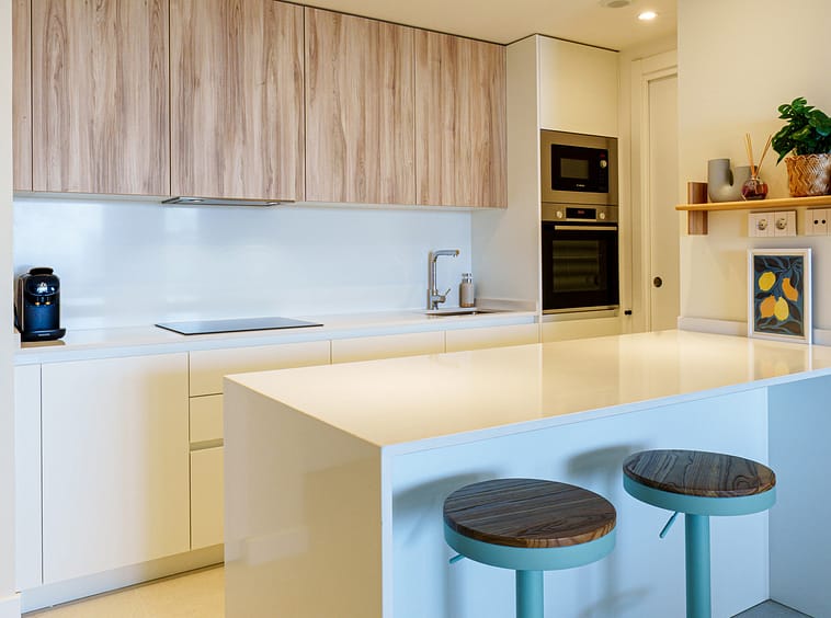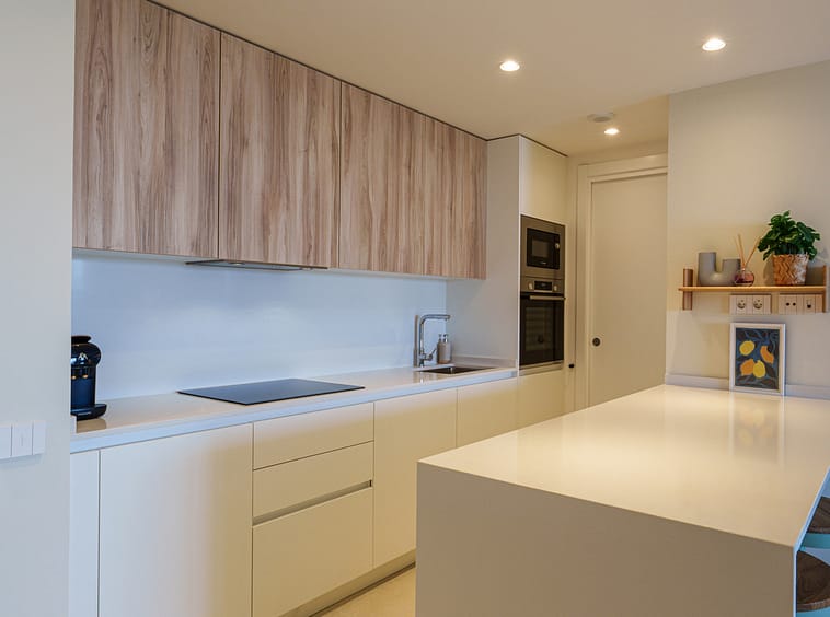 The modern kitchen, open to the living area, is fully equipped with high-quality appliances and ample storage, making it a functional yet stylish space for cooking and entertaining.