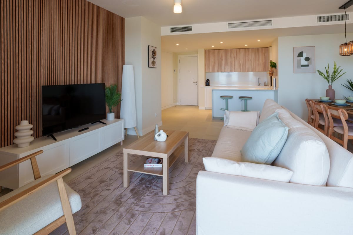 The open-plan living room, creates an inviting and serene space for relaxation. It opens seamlessly onto a large private terrace equipped with comfortable outdoor seating, ideal for al fresco dining or simply soaking in the panoramic sea views.