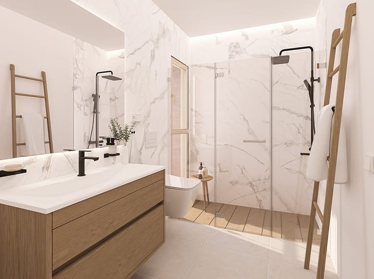Homes range from ground-floor apartments with private gardens to spacious mid-floor units with sea-facing terraces, and penthouses boasting large solariums. Each property has been designed to maximise natural light, with open-plan interiors, floor-to-ceiling windows, and seamless indoor-outdoor living. Interiors feature fully fitted kitchens with modern appliances, large-format porcelain flooring, and high-quality finishes throughout. Double-glazed windows ensure thermal and acoustic insulation, and the building design promotes energy efficiency.