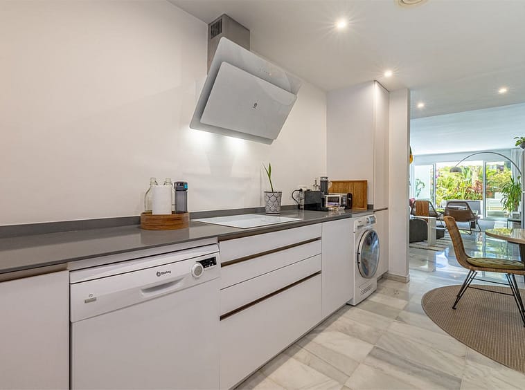The home features a spacious living and dining room that opens onto a covered terrace with direct access to the communal pool. With light pruning of the terrace greenery, partial sea views can also be enjoyed. The fully equipped kitchen includes a separate laundry area.
