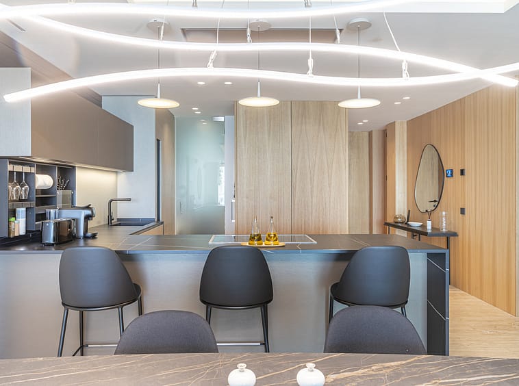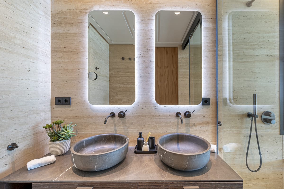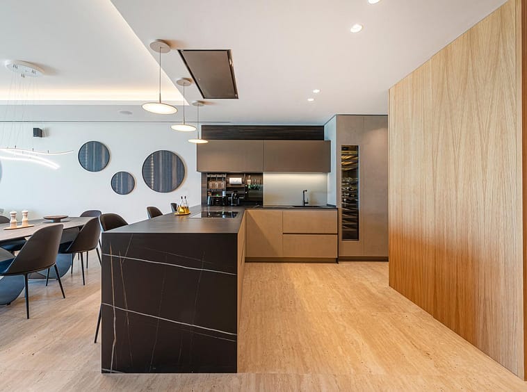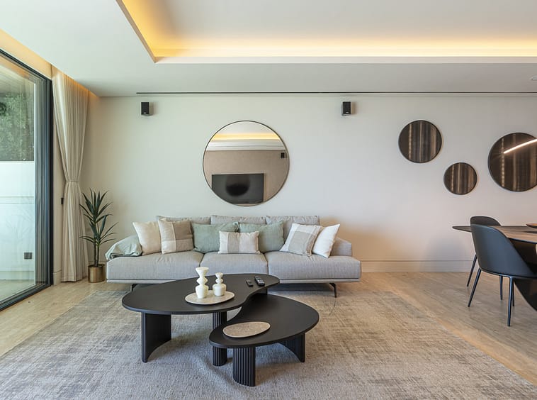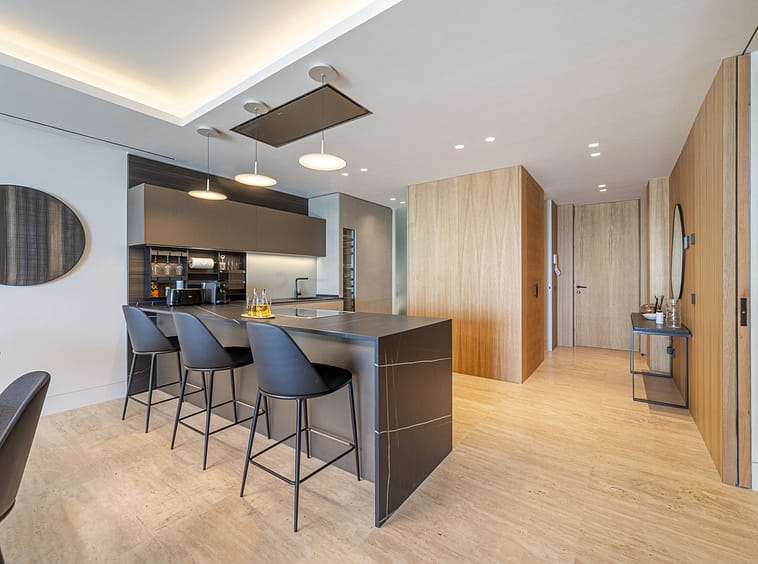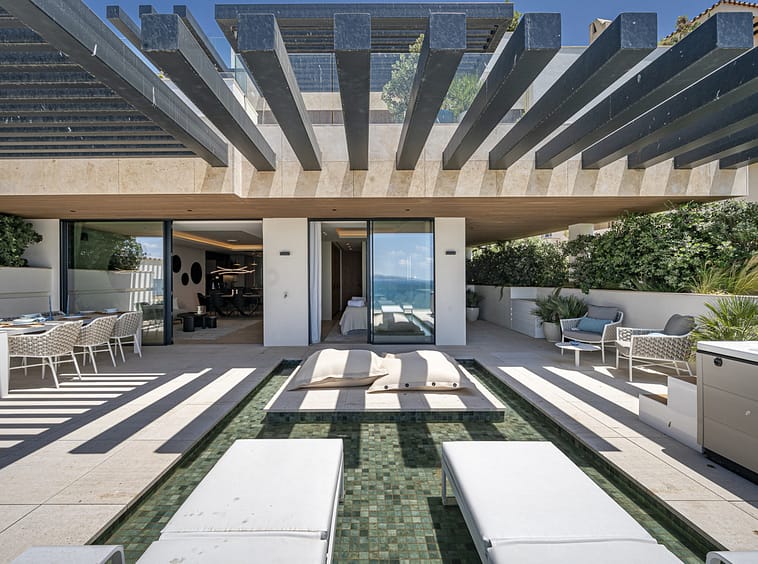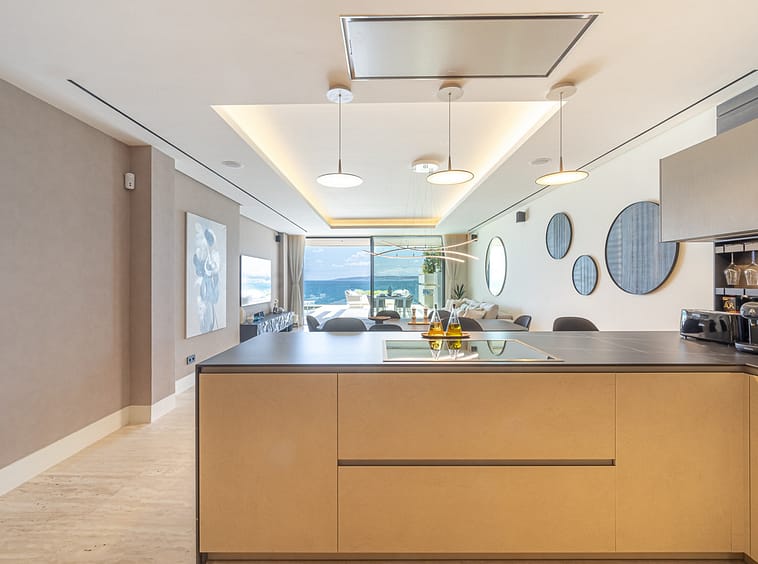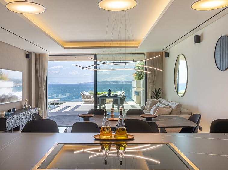 Spanning an impressive 120m² of interior space, the apartment features two generously proportioned bedrooms and two meticulously designed bathrooms. The fully fitted kitchen, equipped with high-end appliances, flows seamlessly into the open-plan dining and living areas, creating a perfect space for entertaining or relaxation. Premium finishes, including marble flooring, double glazing, and glass doors, enhance the sophisticated aesthetic, while the home automation system, central heating, and air conditioning ensure year-round comfort. Additional highlights include a utility room, storage room, and a private garage.