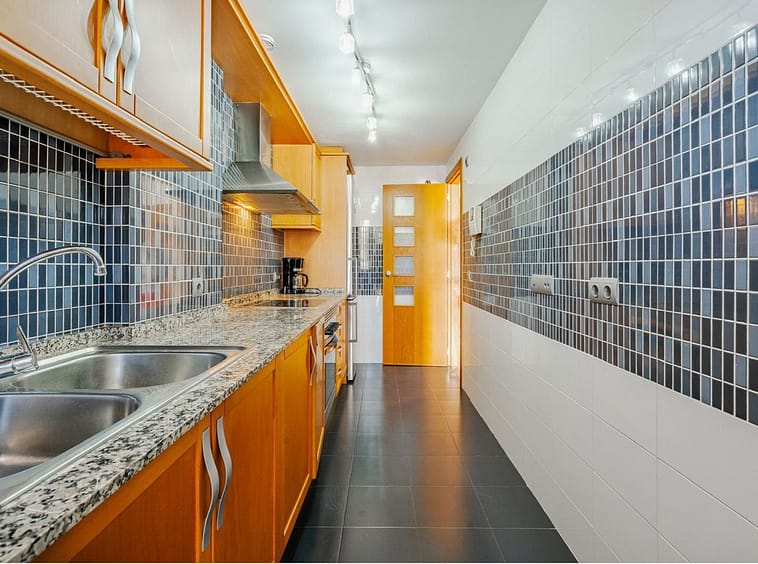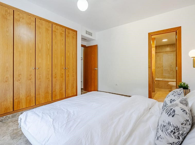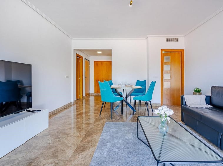 The spacious living room opens directly onto the terrace, creating seamless indoor–outdoor living. The apartment offers two generous bedrooms, both with access to the terrace, and two bathrooms, including an en-suite in the master bedroom.