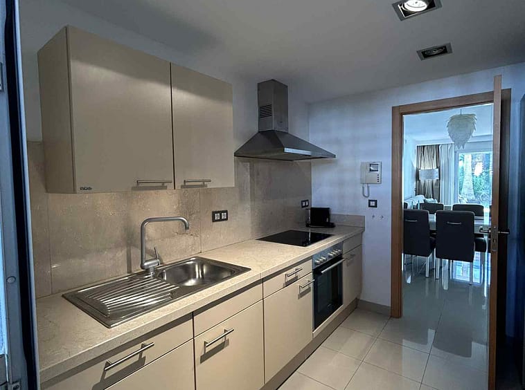 The apartment is west-facing and features a private garden, perfect for enjoying the sunny afternoons and al fresco living. Inside, the apartment is fully furnished and equipped with a state-of-the-art home automation system (domotics) that allows you to control lighting, climate, security, and more with ease, all from your smartphone or tablet. This smart home system adds a layer of convenience, allowing you to customize your environment for comfort and energy efficiency.