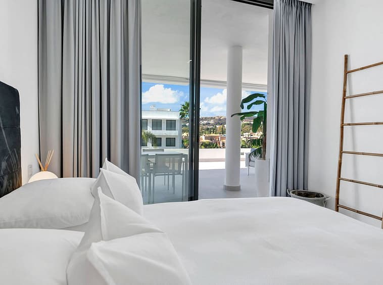 The master suite features an en-suite bathroom, built-in wardrobes, and direct access to the terrace. The second double bedroom also opens onto the terrace, ensuring natural light and privacy throughout.