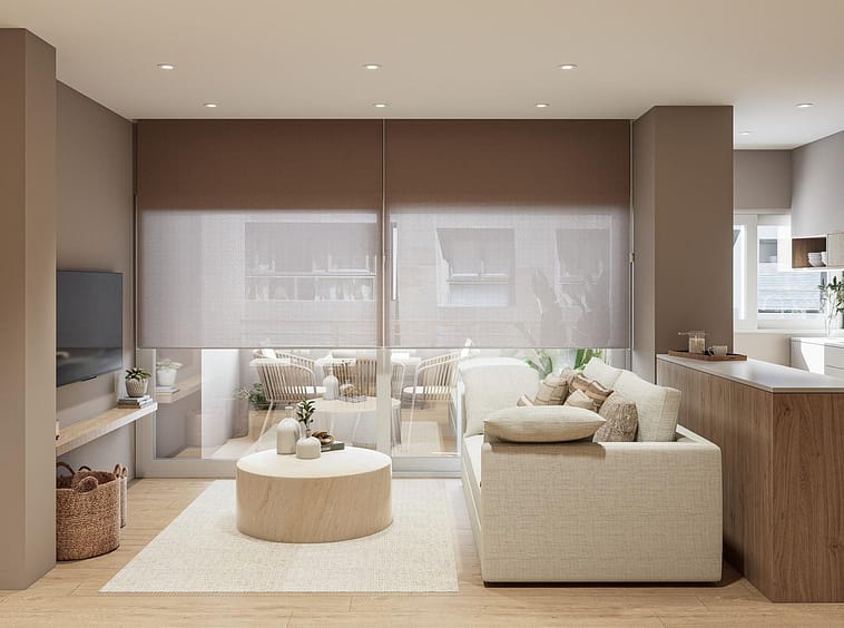 The main area of the property consists of an open-plan living room with an integrated dining area, providing a spacious and bright atmosphere. The parquet flooring and large windows with glass doors add warmth and light to the space. The kitchen, fully equipped and designed in an open-plan style with a peninsula, is integrated into the social area, facilitating interaction and optimal use of space. From the living room, there is access to a balcony-style terrace of approximately 7m², ideal for enjoying the side sea views and the Costa del Sol climate.