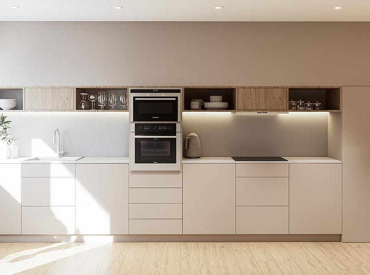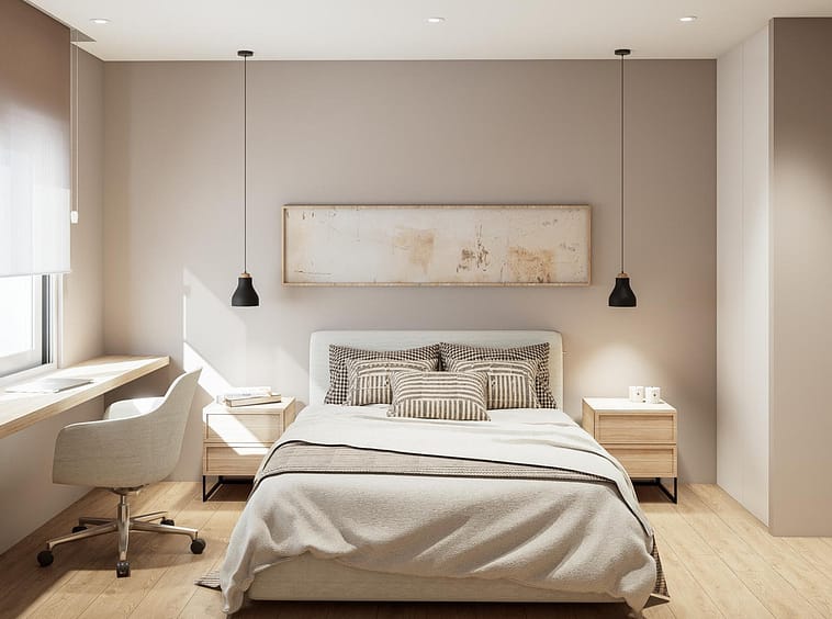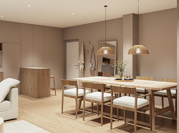 The apartment features two bedrooms, both with built-in wardrobes and modern finishes. The master bedroom has a large private bathroom with a spacious shower, while the second bathroom is also fully equipped and maintains the same contemporary design. Finishes include porcelain flooring in wet areas and double glazing on all windows, ensuring comfort and efficiency.