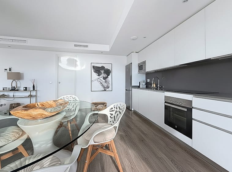 The home features a spacious main living room, designed with an open-concept layout, which integrates perfectly with the private terrace, allowing you to enjoy natural light and direct panoramic sea views. The kitchen, fully equipped and modern in style, is connected to the living room and includes high-quality appliances, as well as a practical laundry area.