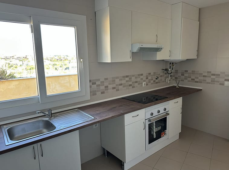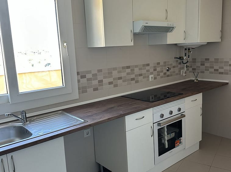 The property features two bright bedrooms, one bathroom, and a spacious living room with direct access to the terrace, creating a light and airy living space. The kitchen is fully equipped with new cabinetry and a practical, functional layout with good storage.