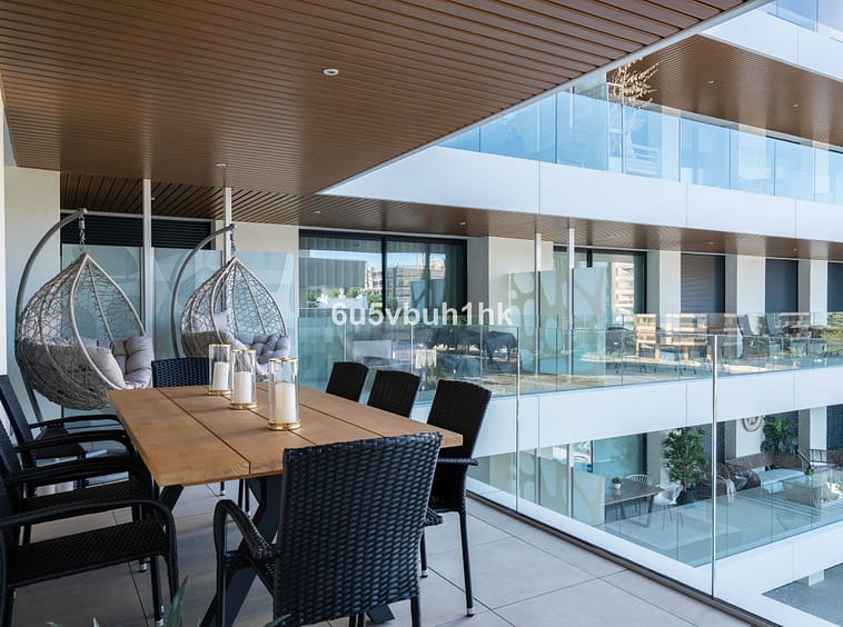 It moves softly through the space, drawing your eyes toward the terrace and the peaceful communal gardens outside, reminding you how close the sea truly is.