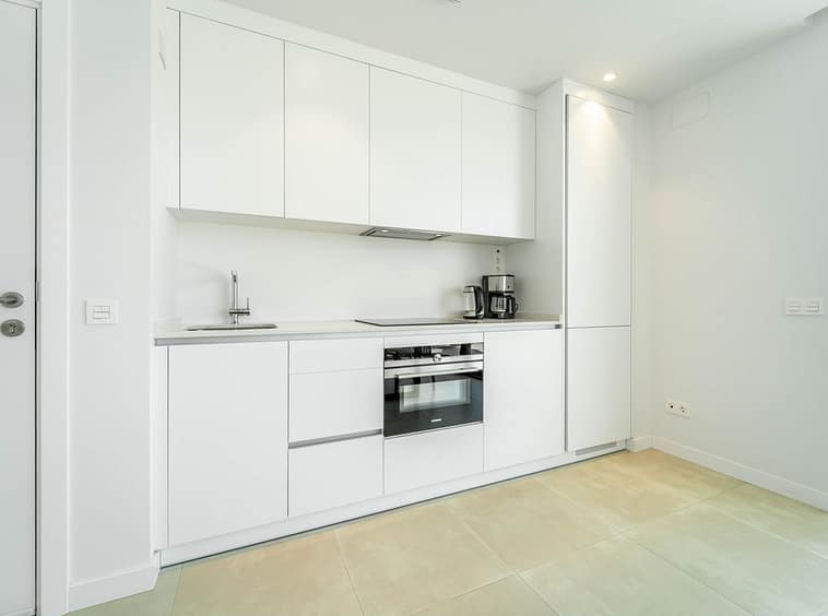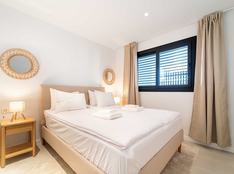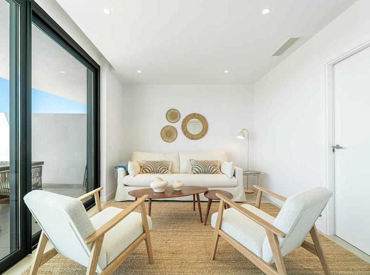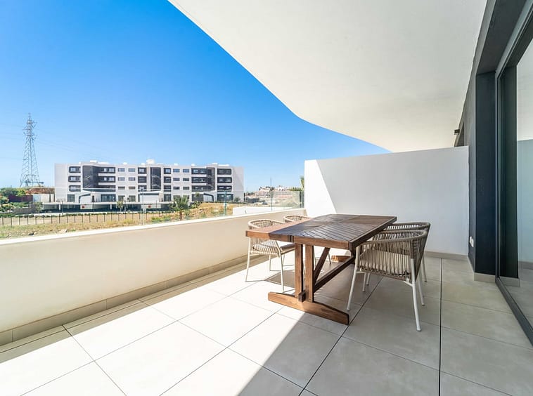 The apartment features two spacious bedrooms and two bathrooms, including a master suite with ensuite layout.. Indoors, comfort is ensured with underfloor heating in the bathrooms, aerothermal climate control, and a modern fitted kitchen. Outdoors, the elevated terrace becomes an extension of the living space — perfect for relaxed mornings, alfresco dining, or evening gatherings.