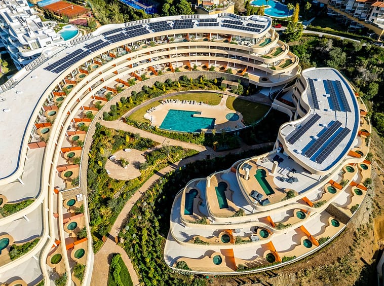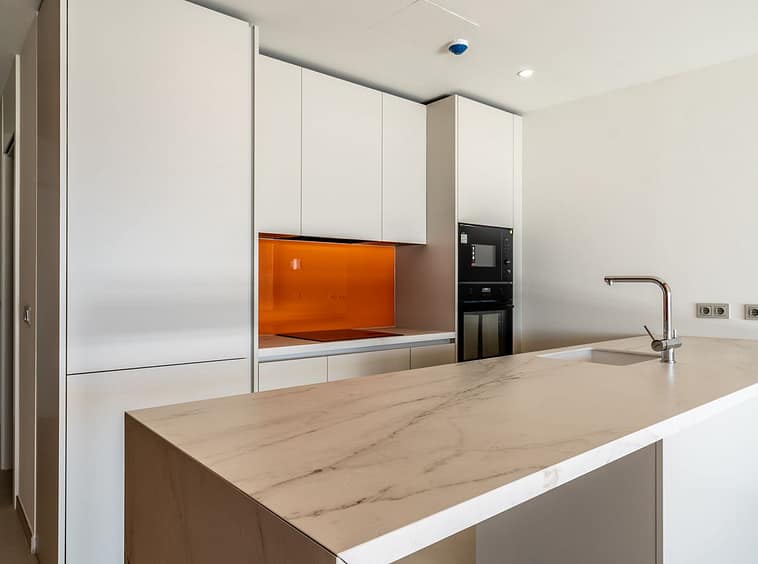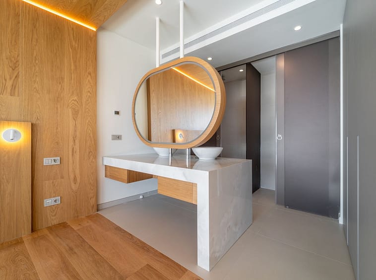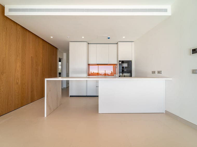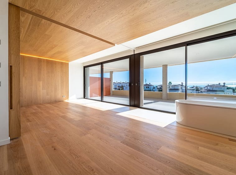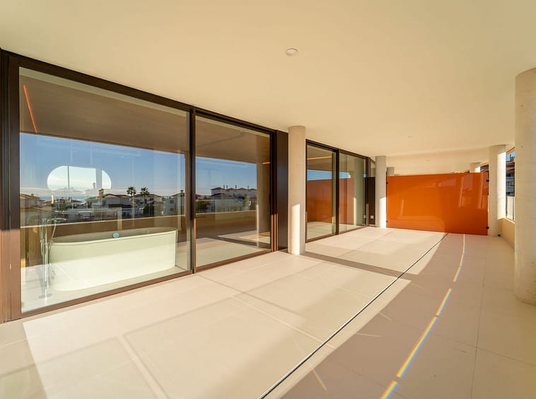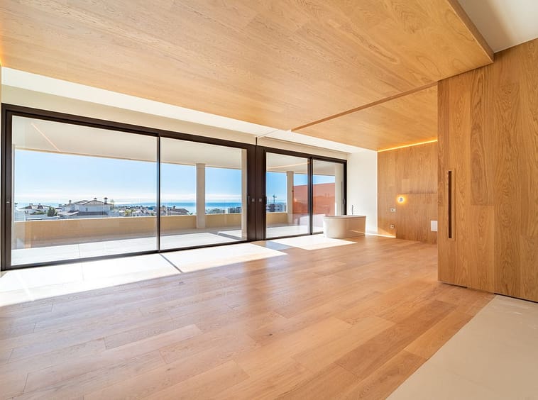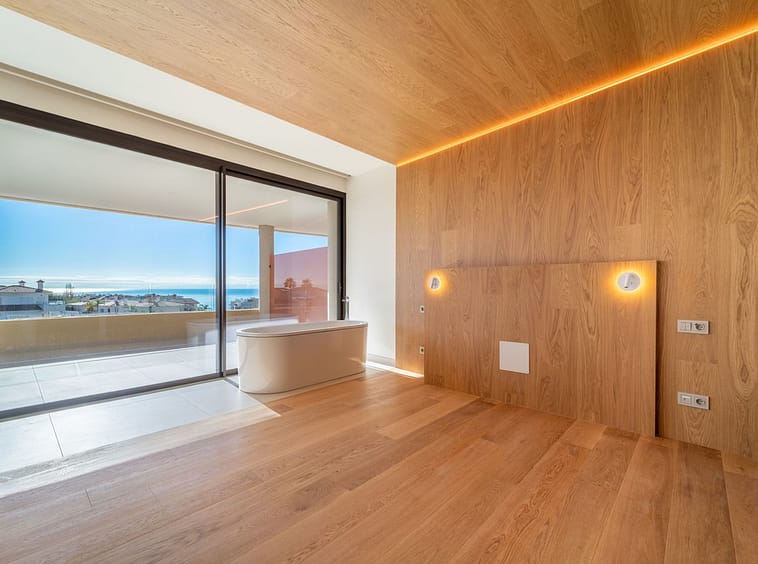 Main bedroom with ensuite bathroom and walk-in closet. This apartment is distinguished by the ingenious movable wall that connects the master bedroom-suite to the living room. This elongated sliding door is designed to duplicate the entrance of natural light and enjoying much better views. This easy interaction between the living spaces creates a flexible open area that is designed for you to enjoy the climate and lifestyle of Southern Spain. This clever design not only maximises the natural light of the Costa del Sol in both rooms, but also allows you to admire the splendid views from every corner of your home. Air conditioning hot and cold, video intercom, domotic system, pre-installation alarm system, water filter system, under floor heating in both bedrooms and bathrooms. Includes two parking spaces (one with electric car charger) and one storage room.